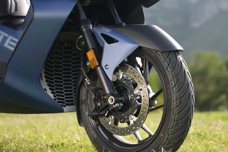 Hệ thống treo gồm phuộc ống lồng phía trước và giảm xóc đôi phía sau có khả năng tinh chỉnh, giúp xe vận hành êm ái hơn ở nhiều loại địa hình. Bộ mâm kích thước 15 inch (trước) và 14 inch (sau) kết hợp lốp bán trơn 120/70-15 và 140/70-14 mang lại độ bám tốt, phù hợp cả đi phố lẫn đi xa. Về an toàn, Zontes 368E được trang bị phanh đĩa cho cả hai bánh, ABS kênh đôi và hệ thống kiểm soát lực kéo - trang bị tương đương các mẫu xe ga cao cấp như Honda SH.