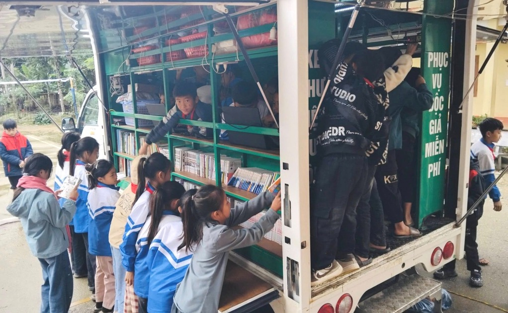 Học sinh Trường THPT Lý Bôn tham gia đọc sách, tra cứu Internet tại xe thư viện lưu động đa phương tiện.