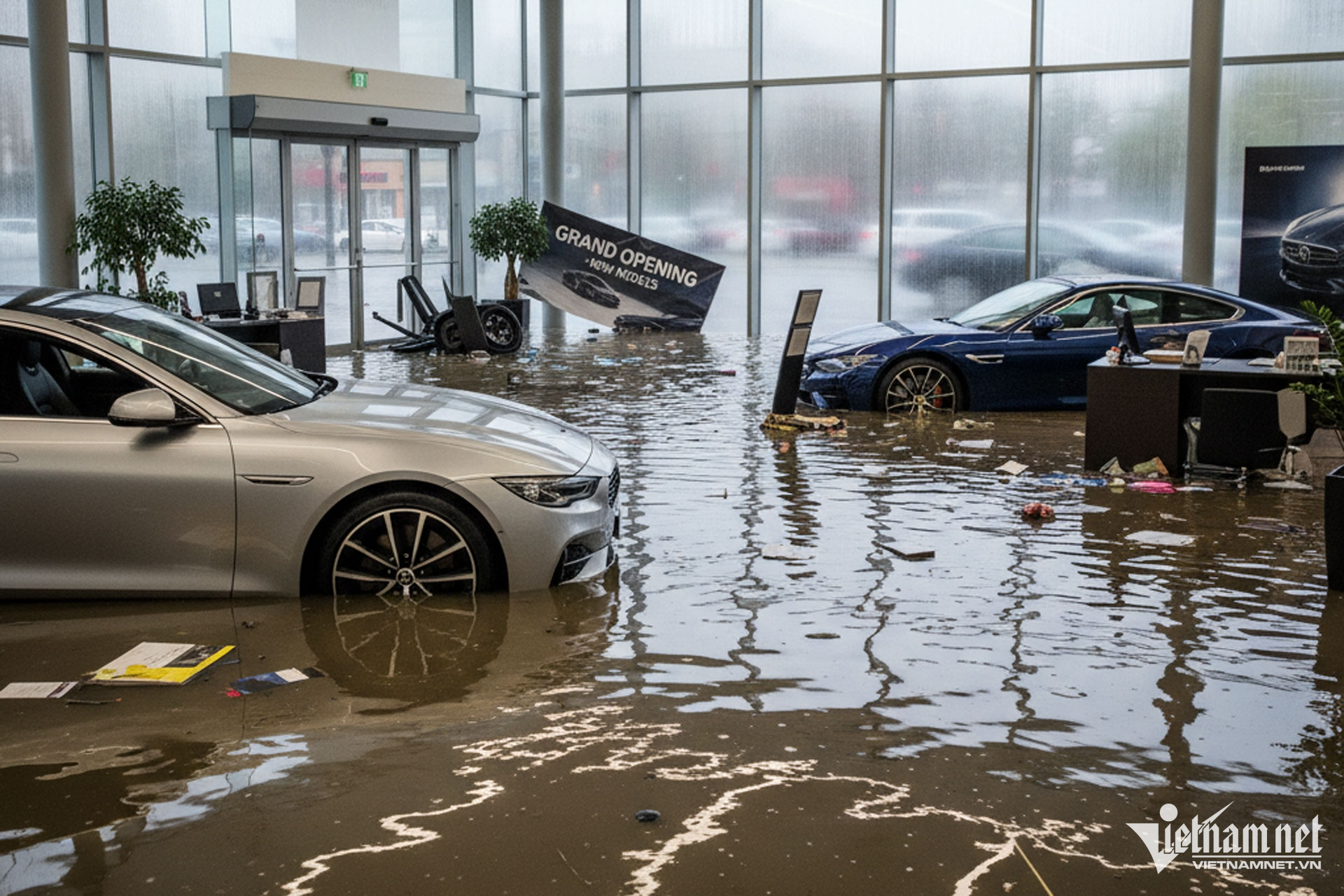 Xe mới chưa ban giao cho khách bị ngập nước sẽ xử lý thế nào đang là câu hỏi của nhiều người. Ảnh minh họa do AI tạo