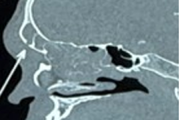 Kết quả chụp CT scan mũi xoang ghi nhận viêm đa xoang và vùng hủy xương thành trước xoang trán phải