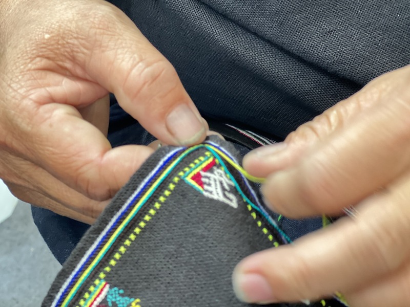 Giữa không gian rực rỡ sắc màu, những đôi tay chai sạn vì sương gió vẫn thoăn thoắt từng đường kim, mũi chỉ. Trên nền vải chàm, dần hiện lên những họa tiết tinh xảo, mang đậm bản sắc văn hóa vùng cao.