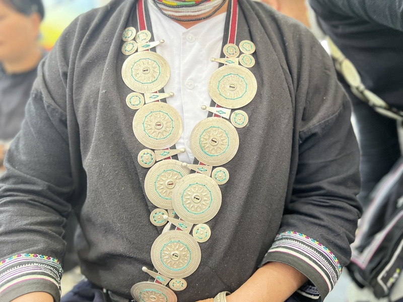 Những đồng xu bạc trên cổ áo với họa tiết đặc trưng của người Dao Tiền
