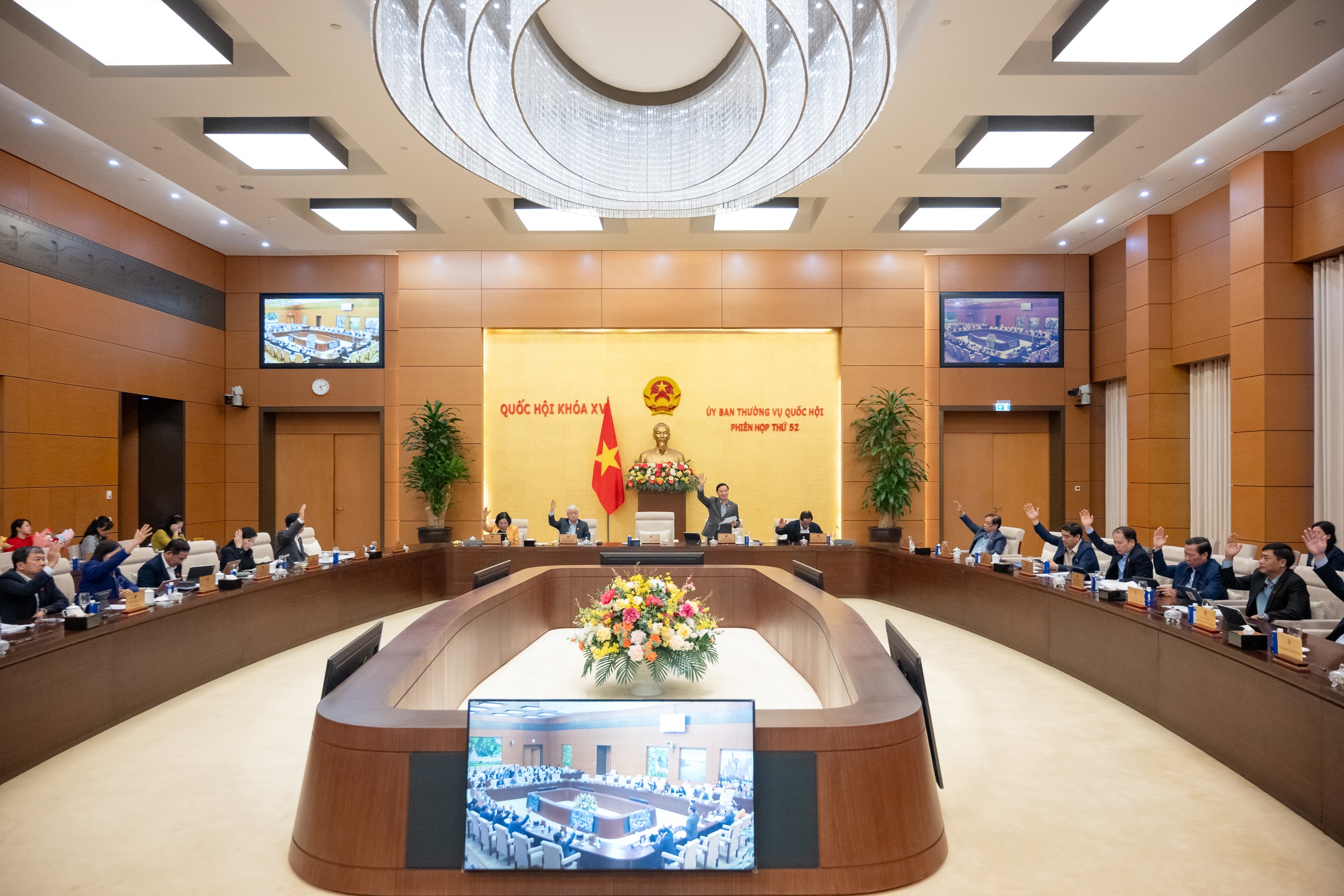 Tại Phiên họp, 100% Ủy viên Ủy ban Thường vụ Quốc hội có mặt tán thành biểu quyết thông qua Nghị quyết của Ủy ban Thường vụ Quốc hội về tiêu chuẩn của đơn vị hành chính và Nghị quyết của Ủy ban Thường vụ Quốc hội về phân loại đô thị.