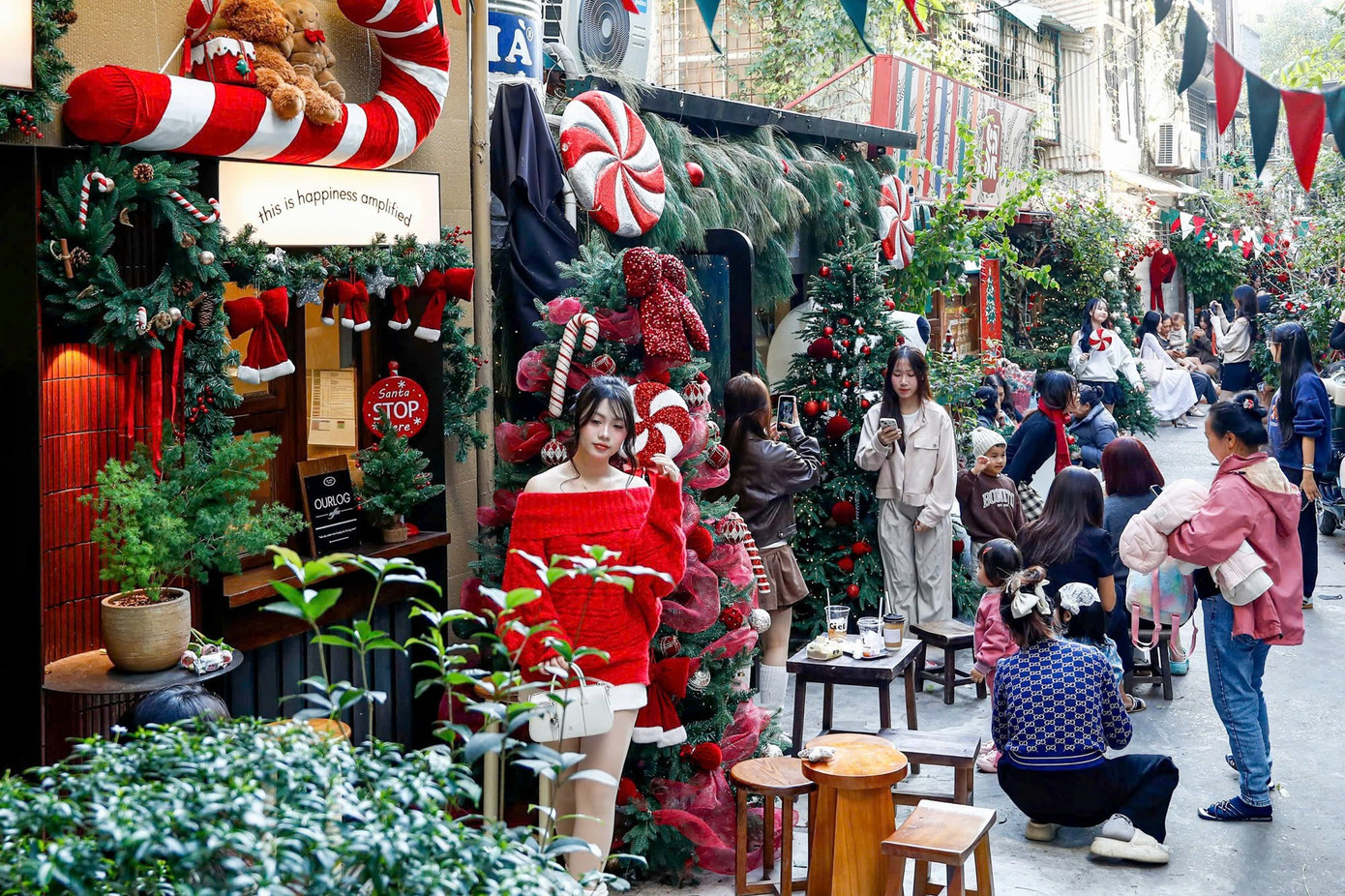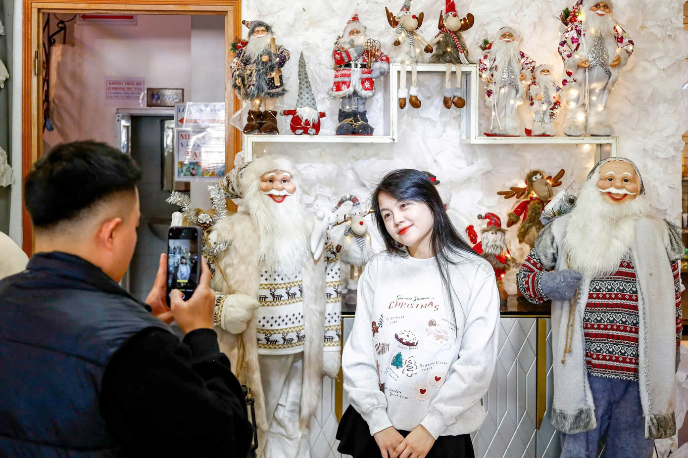 Nhân viên một quán tại khu vực Văn Miếu tiết lộ: Giờ cao điểm thường là buổi trưa, khi dân văn phòng tranh thủ nghỉ ngơi, hoặc sau 20h - khi các nhóm bạn tụ họp "lên đồ" đi chơi. “Các bạn trẻ thích diện đồ đỏ và trắng, vừa đúng concept, vừa nổi bật. Chỉ cần phối thêm khăn len, mũ nồi hay áo khoác nữa là bộ ảnh Giáng sinh auto lung linh", nữ nhân viên cho biết.