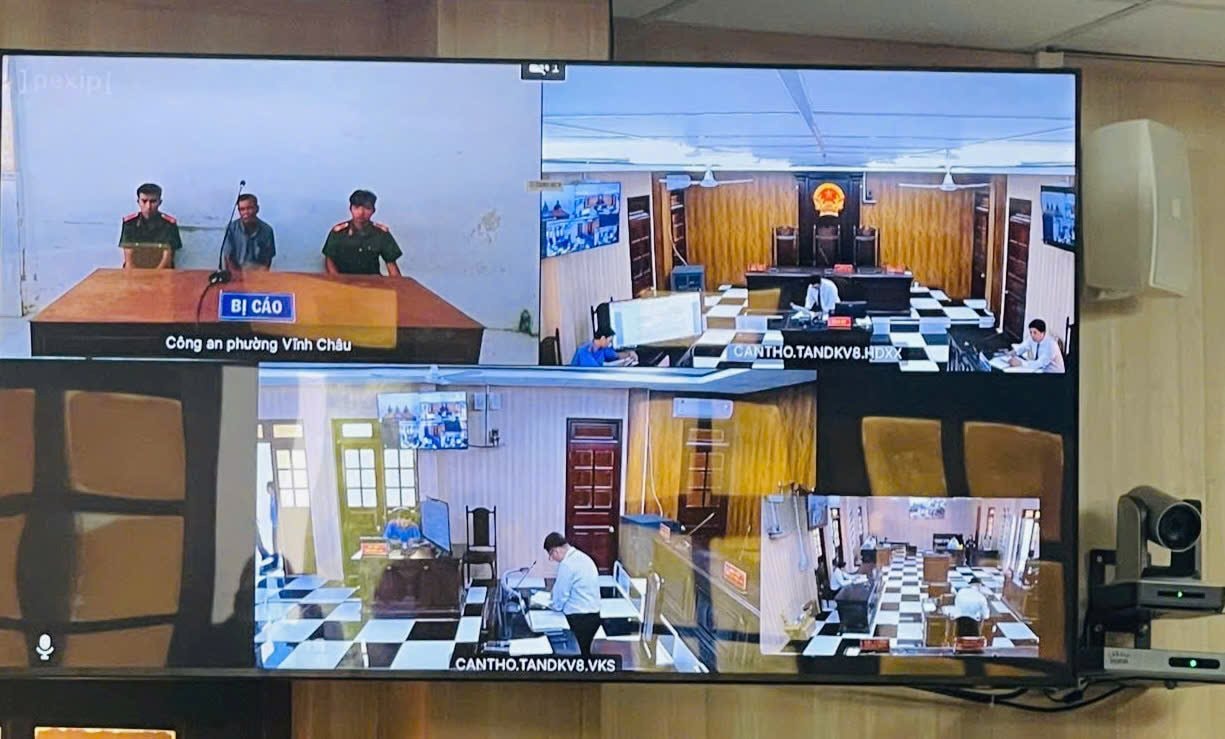 Bị cáo tham gia phiên tòa tại điểm cầu thành phần đặt tại Công an phường Vĩnh Châu, TP Cần Thơ.