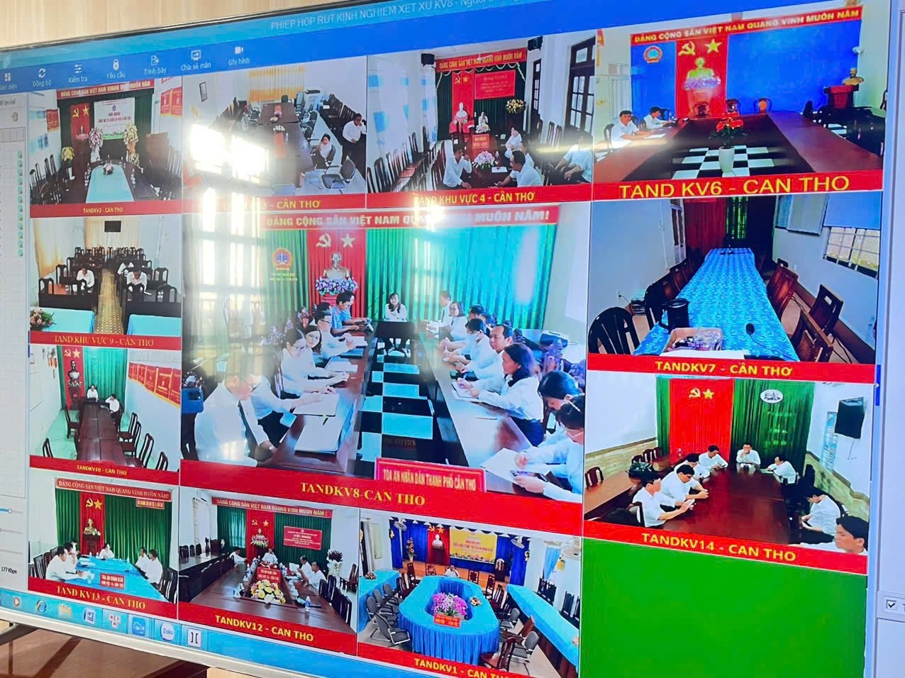 Phiên họp rút kinh nghiệm 2 cấp được kết nối trực tuyến giữa TAND TP Cần Thơ và các TAND khu vực sau khi kết thúc phiên tòa.