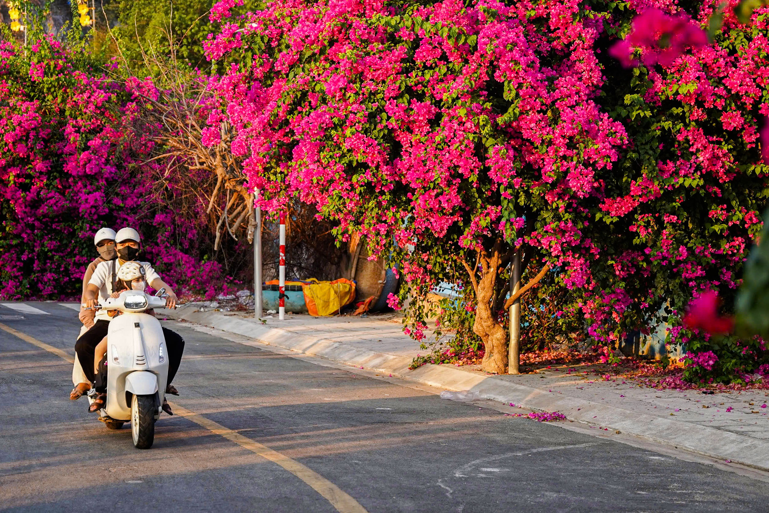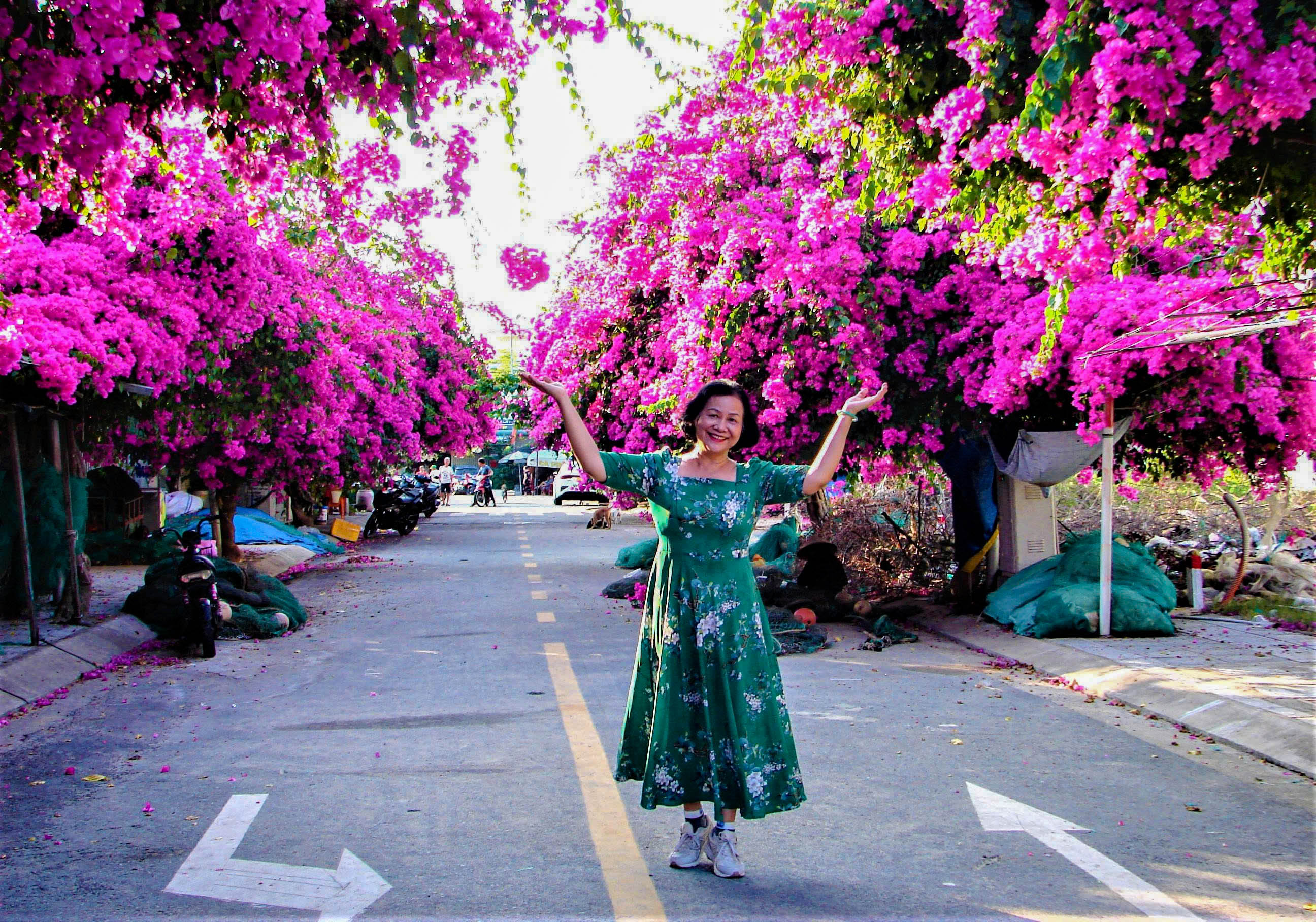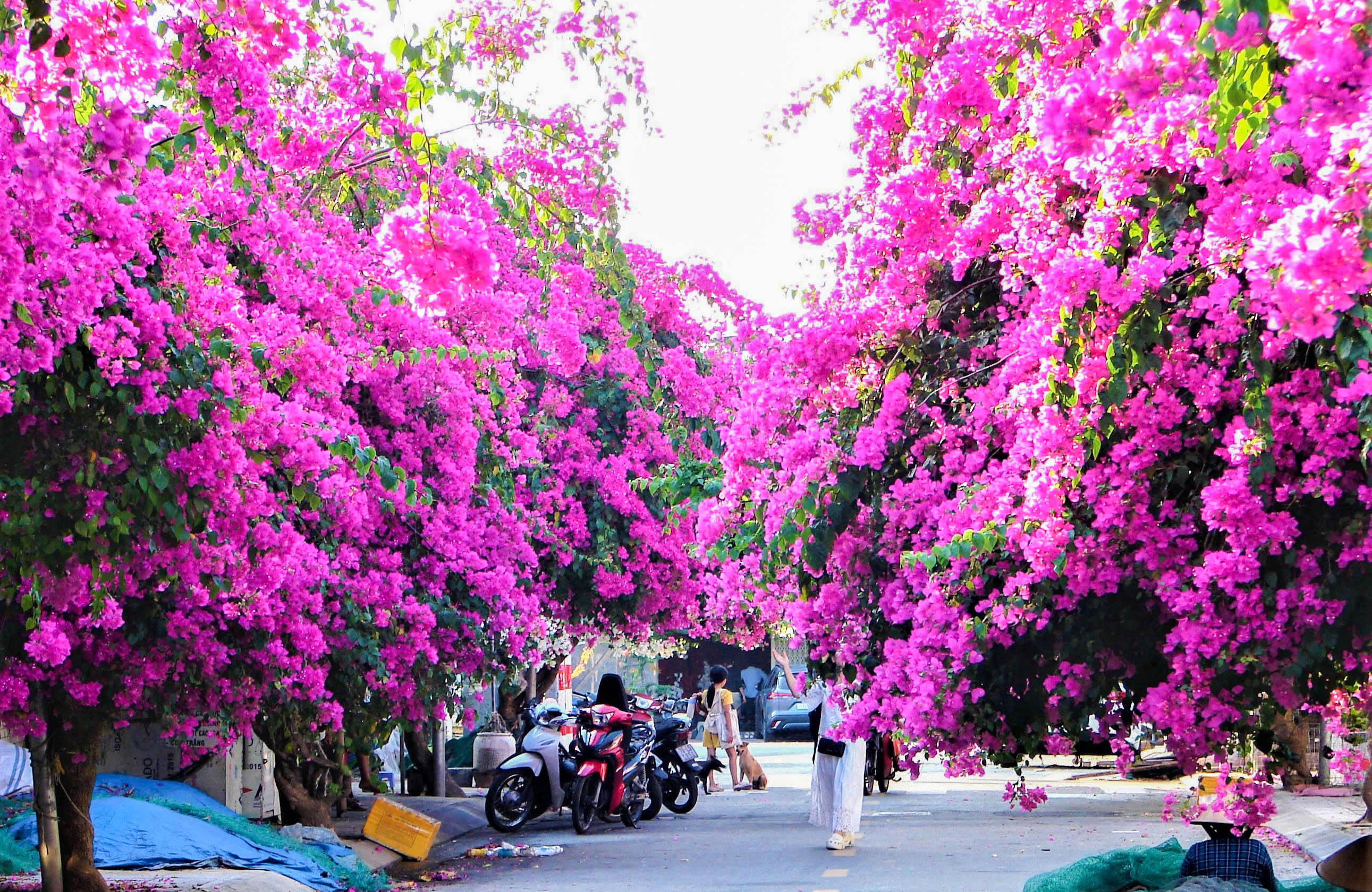 Hoa giấy kết từng chùm lớn, tạo thành những vòm tán dày trên đoạn đường khoảng 100 m, làm đẹp cảnh quan và hình thành không gian check-in hấp dẫn.