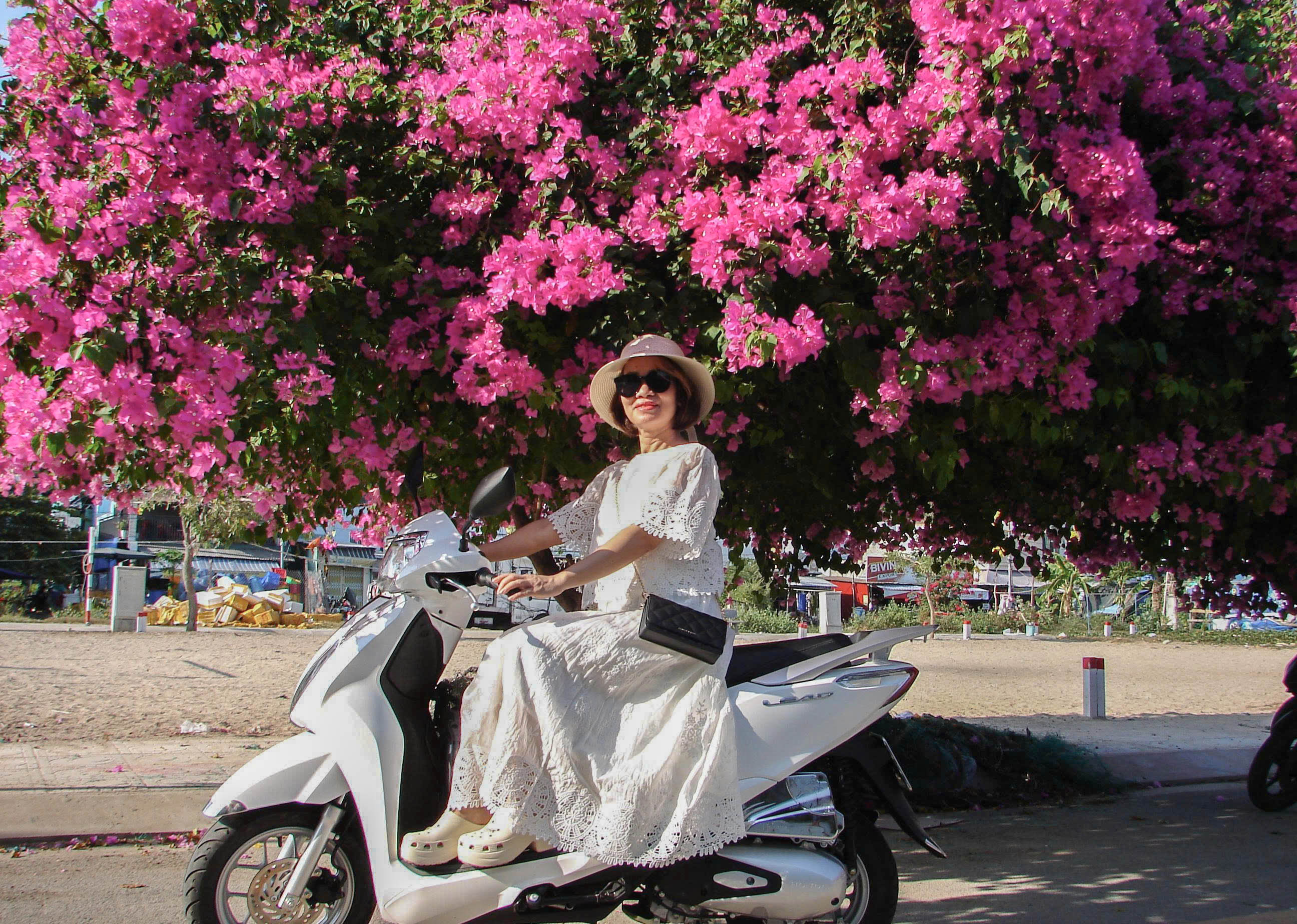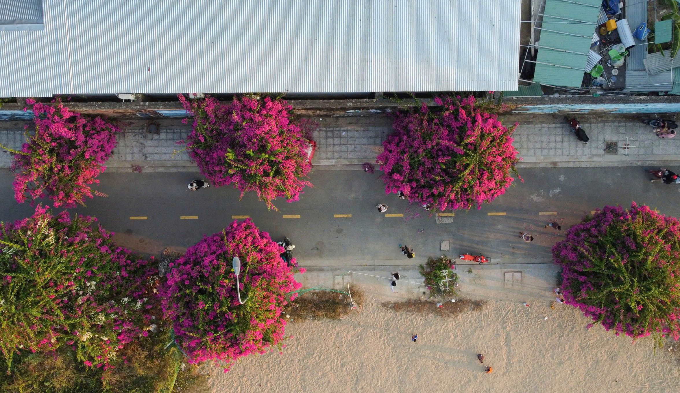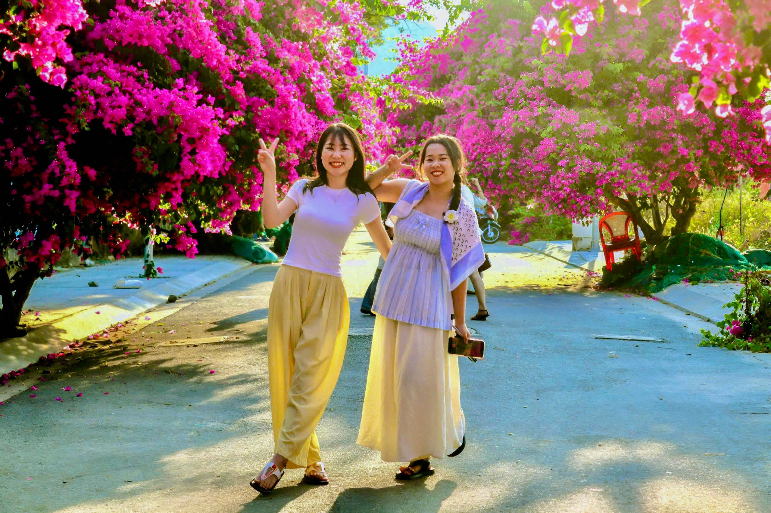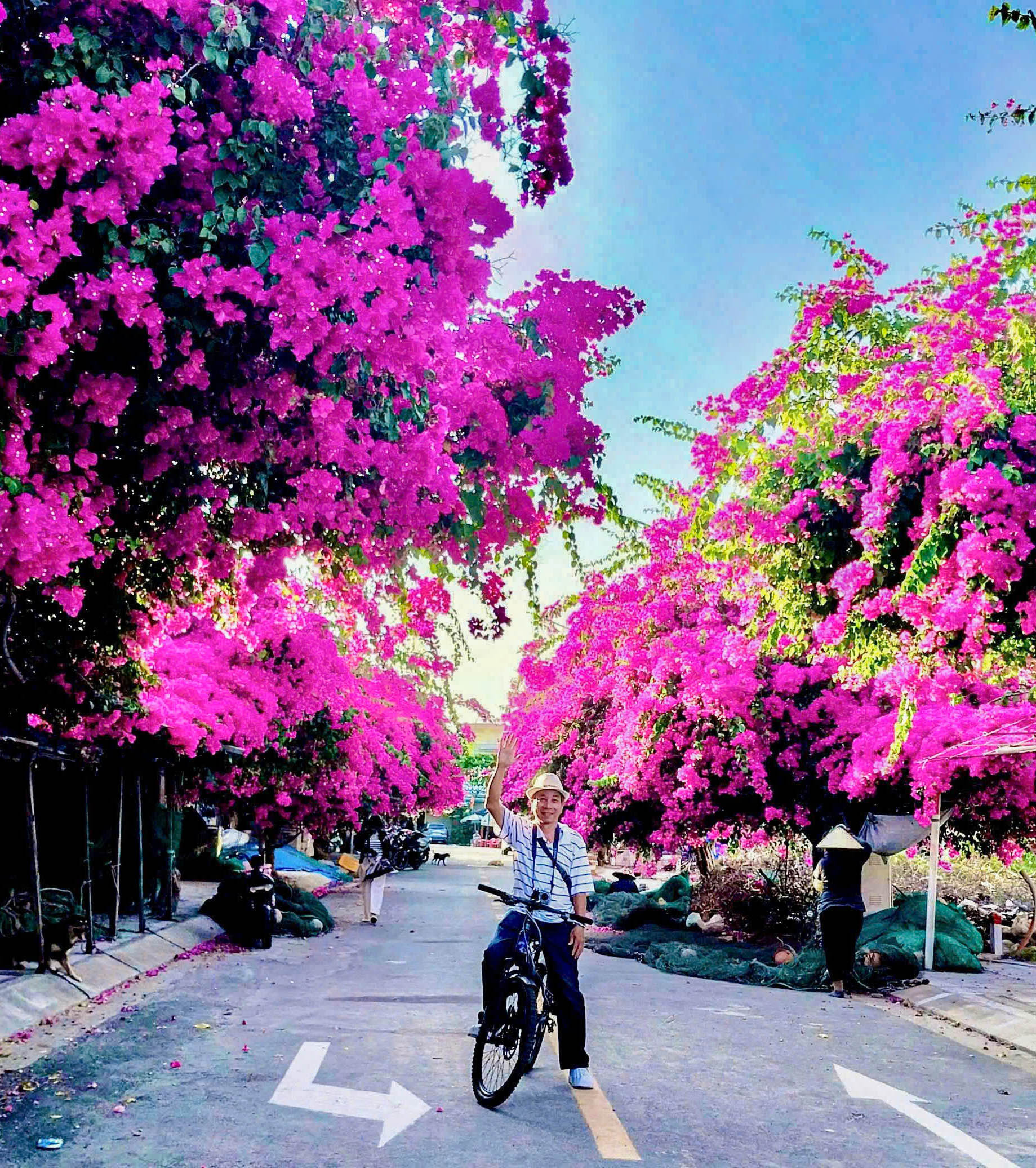 Hoa giấy kết từng chùm lớn, tạo thành những vòm tán dày trên đoạn đường khoảng 100 m, làm đẹp cảnh quan và hình thành không gian check-in hấp dẫn.
