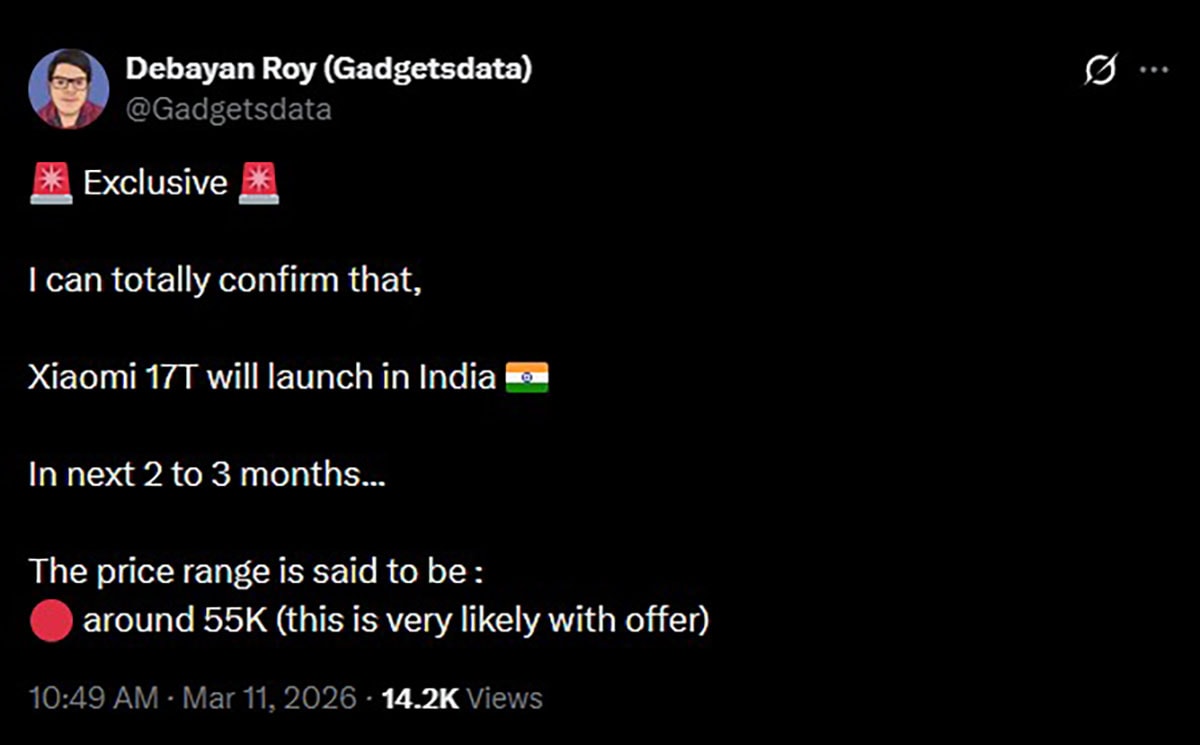 Dữ liệu từ leaker Gadgetsdata cho biết Xiaomi 17T có thể chính thức ra mắt trong vòng 2 đến 3 tháng tới. Tại thị trường Ấn Độ, máy được dự đoán có giá khởi điểm từ 55,000 INR, tương đương khoảng 15.63 triệu đồng. Đây là mức giá cạnh tranh đối với một thiết bị sở hữu nhiều nâng cấp về phần cứng và khả năng nhiếp ảnh.