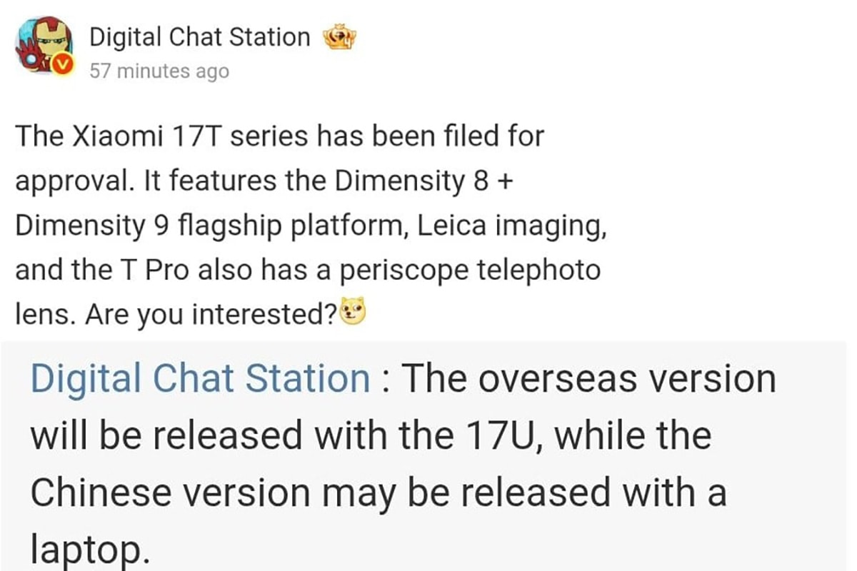 Xiaomi 17T Series được đồn đại ra mắt cùng Xiaomi 17 Ultra