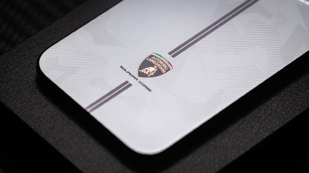 Mặt lưng màu trắng sang trọng kết hợp logo Lamborghini và dải sọc hình chữ Y lấy cảm hứng từ đường đua.
