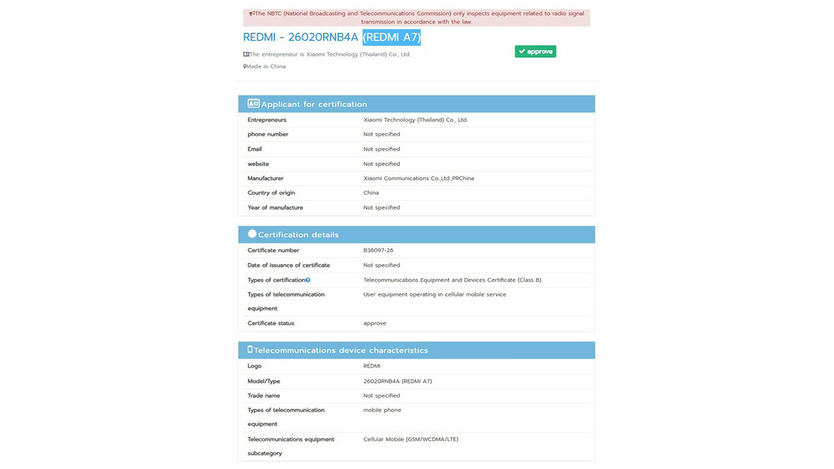 Bên cạnh phiên bản tiêu chuẩn, biến thể Redmi A7 Pro cũng đã xuất hiện trên các nền tảng chứng nhận quan trọng như TDRA (UAE) và NBTC. Các tài liệu này xác nhận thiết bị sẽ hỗ trợ kết nối mạng 4G thay vì 5G, một chiến lược quen thuộc của Xiaomi nhằm tối ưu hóa chi phí và giữ mức giá dễ tiếp cận cho người dùng phổ thông.