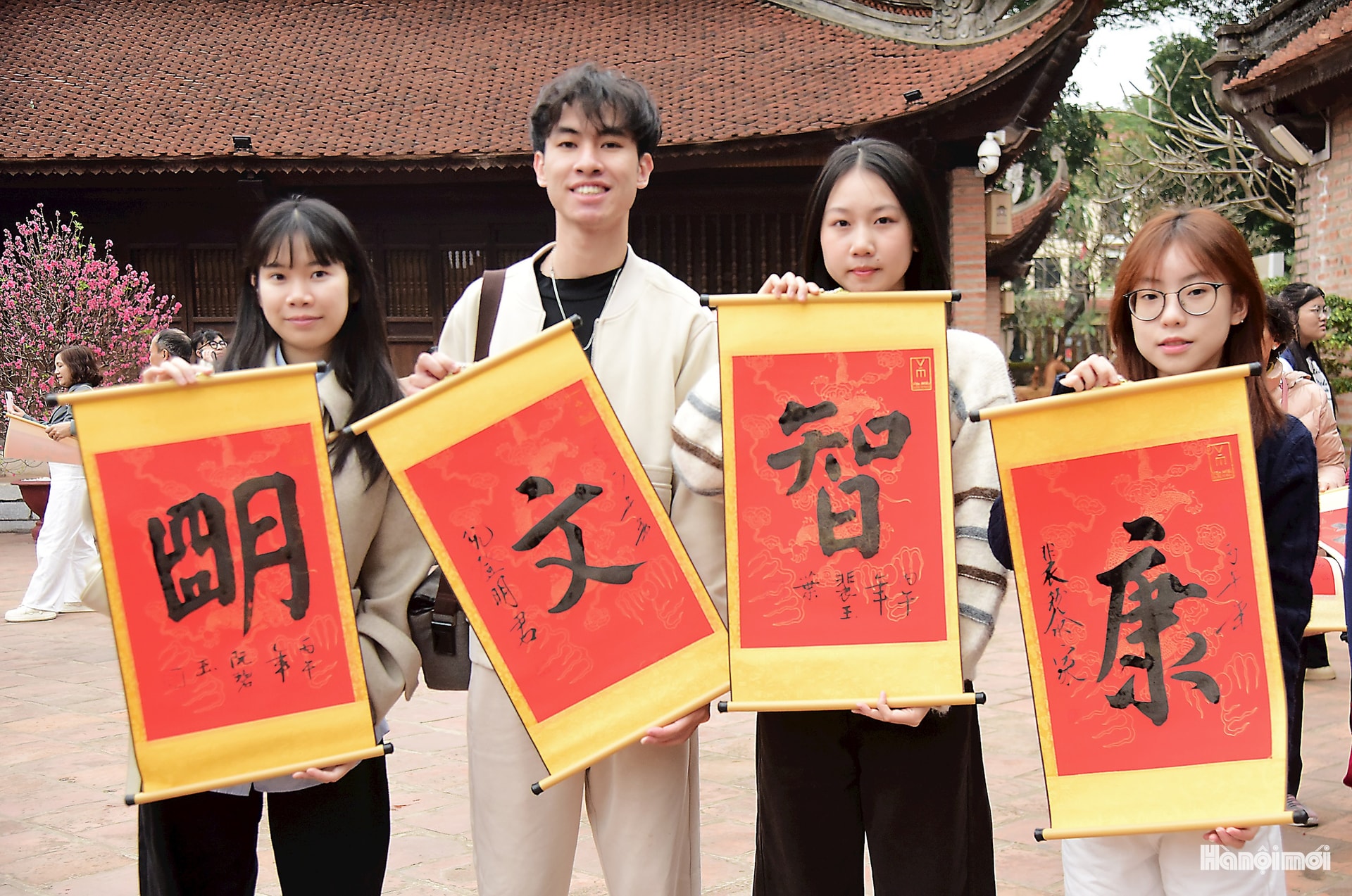 Nhóm bạn trẻ đến từ Trường THPT Lương Thế Vinh rất vui khi xin được những chữ ưng ý.