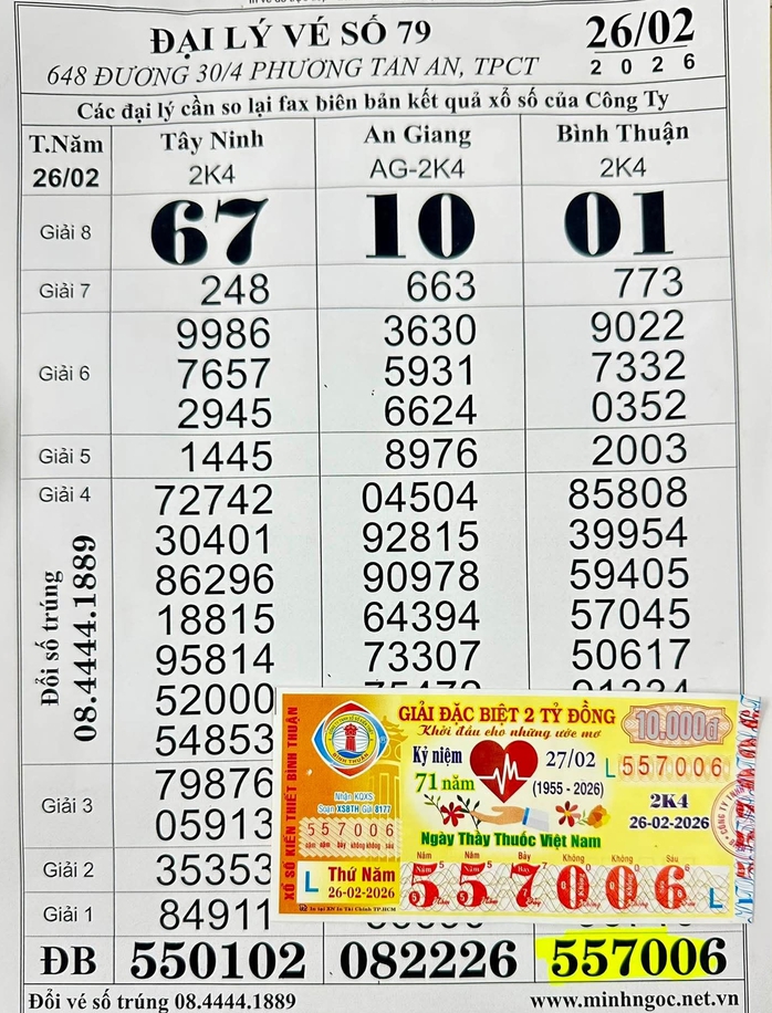 Theo đó, vé số Bình Thuận, do Công ty TNHH Một thành viên Xổ số kiến thiết Bình Thuận mở thưởng chiều 26-2, giải độc đắc (dãy số 557006) được xác định trúng tại TP Cần Thơ.