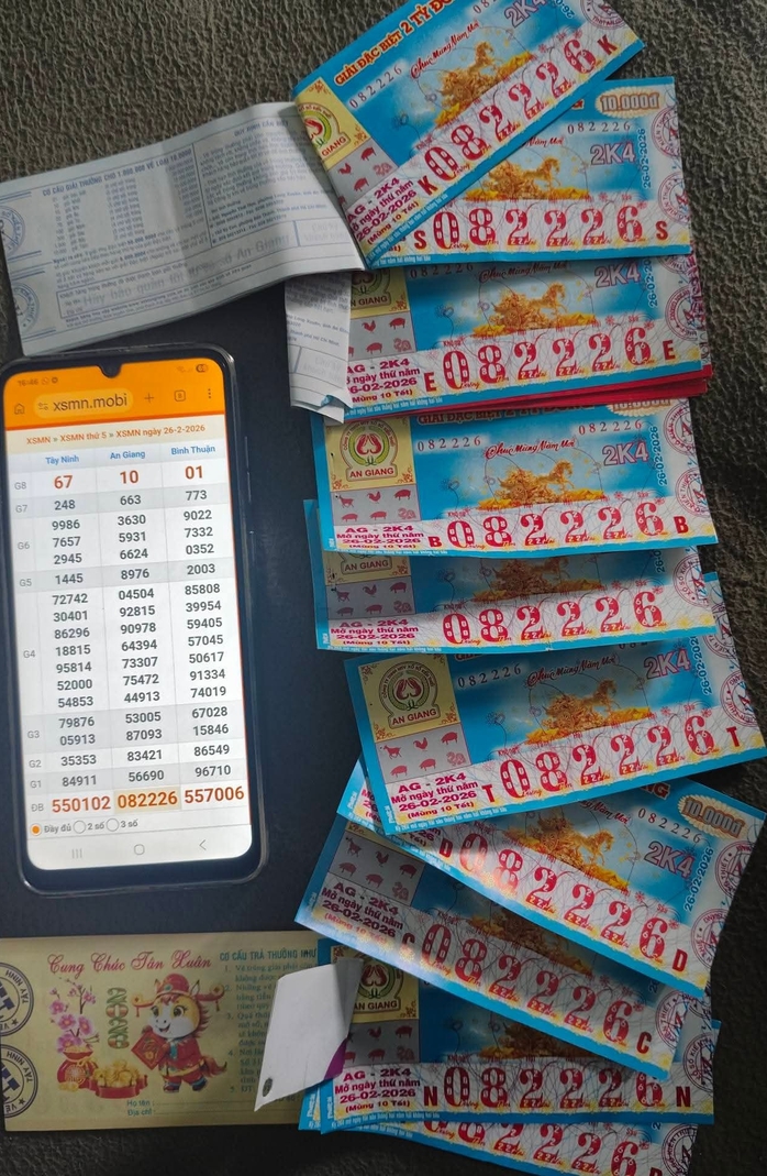 Mở thưởng cùng ngày với vé số Bình Thuận, giải độc đắc (dãy số 082226) của vé số An Giang được xác định trúng tại TPHCM. Nơi đổi thưởng cho chủ nhân đầu tiên trúng độc đắc 10 vé An Giang là đại lý vé số Duyên Nguyễn ở phường Phú Mỹ, TPHCM. 6 vé An Giang trúng độc đắc còn lại chưa lộ diện chủ nhân may mắn.
