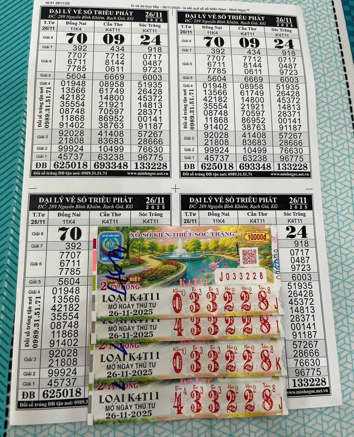 Đối với vé số Sóc Trăng kỳ vé K4T11, mở thưởng chiều 26-11, giải đặc biệt (dãy số 133228) vẫn chưa lộ diện chủ nhân may mắn. Tuy nhiên, giải an ủi (50 triệu đồng/vé) đã xác định trúng thưởng tại tỉnh An Giang. Nơi đổi thưởng cho những vé trúng đầu tiên là đại lý vé số Triều Phát và đại lý vé số Trương Phến ở phường Rạch Giá, tỉnh An Giang.