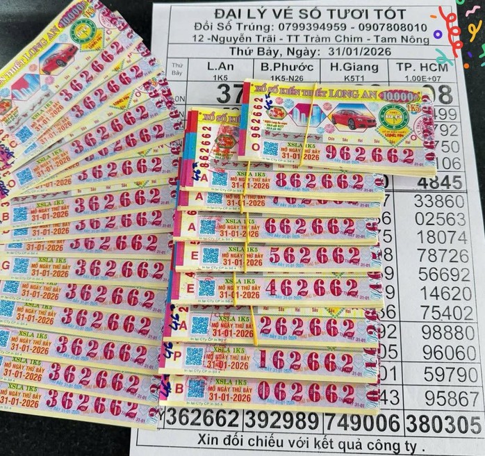 Theo đó, giải độc đắc (dãy số 362662) và giải an ủi của vé số Long An, do Công ty TNHH Một thành viên Xổ số kiến thiết Long An mở thưởng chiều 31-1, được xác định trúng tại tỉnh Đồng Tháp.
