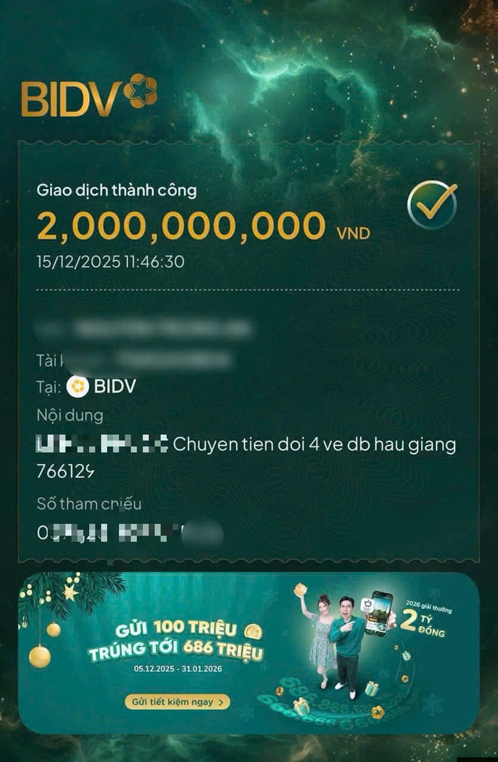 Vé số Hậu Giang trúng độc đắc được đổi thưởng tại đại lý vé số Phước Danh qua hình thức chuyển khoản lẫn tiền mặt