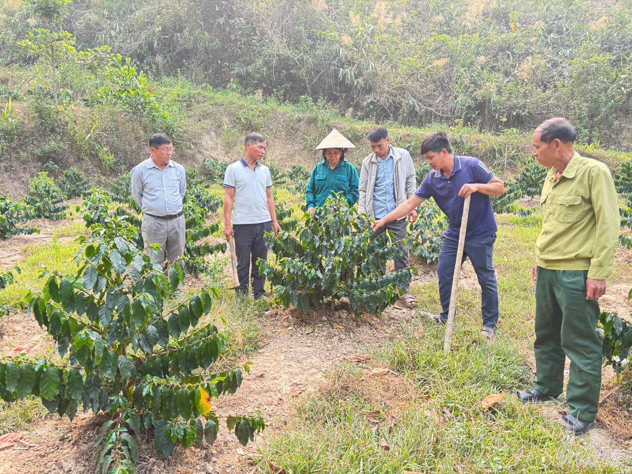 Anh Quàng Văn Thoại (thứ 2 từ phải sang), bản Xôm, xã Mường Nhà hướng dẫn người dân cách trồng, chăm sóc cây cà phê.