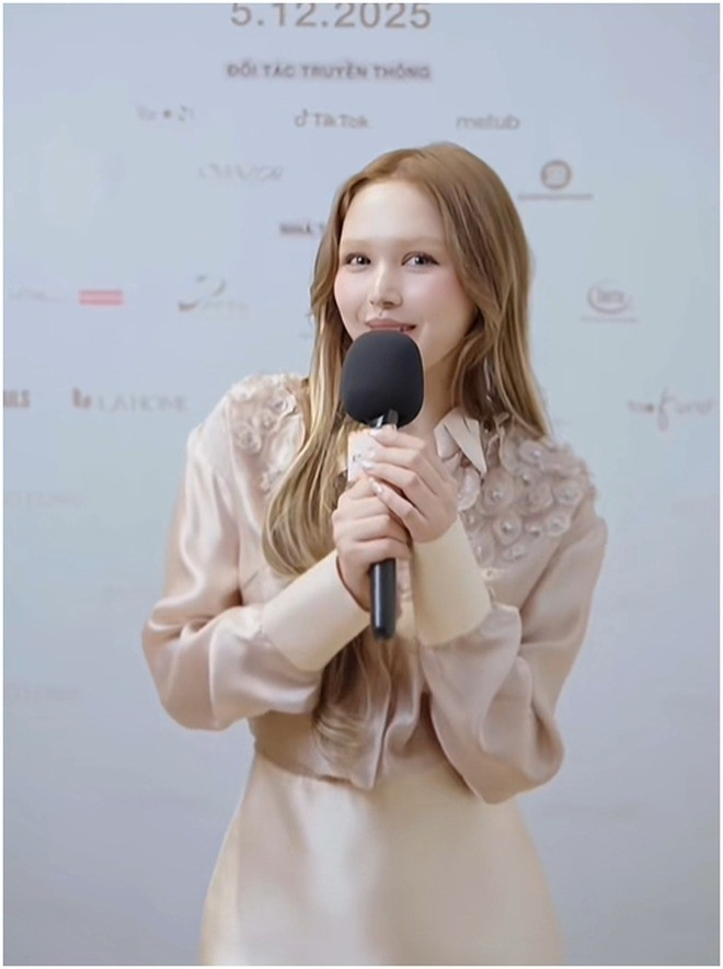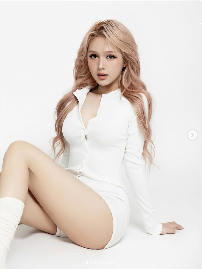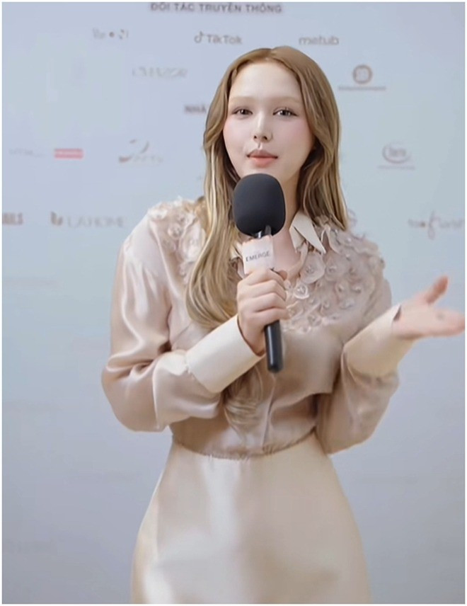Trái với phong cách rạng rỡ, sắc sảo thường thấy, lần này Xoài Non xuất hiện với lớp trang điểm trong trẻo, lông mày tẩy nhạt – tạo tổng thể visual lạ mắt, mang hơi hướng high-fashion và editorial.