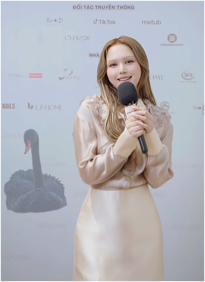 Trong trang phục tông màu kem thanh lịch, Xoài Non chọn chiếc đầm satin mềm mại, điểm nhấn nằm ở phần cổ áo được đính hoa nổi cầu kỳ. Thiết kế tinh tế kết hợp cùng mái tóc dài uốn nhẹ tôn lên vẻ nữ tính và nhẹ nhàng của cô.