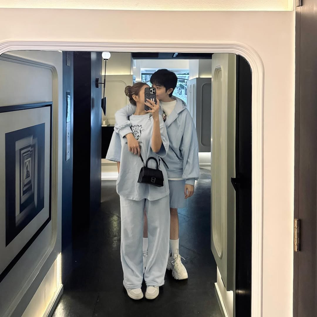 Trong ảnh, cả hai diện trang phục đồ đôi tông màu xanh da trời nhạt vô cùng đồng điệu, tạo nên vẻ ngoài trẻ trung, năng động và hài hòa. Gil Lê đứng phía sau, vòng tay ôm eo Xoài Non đầy âu yếm. (Ảnh: FBNV)