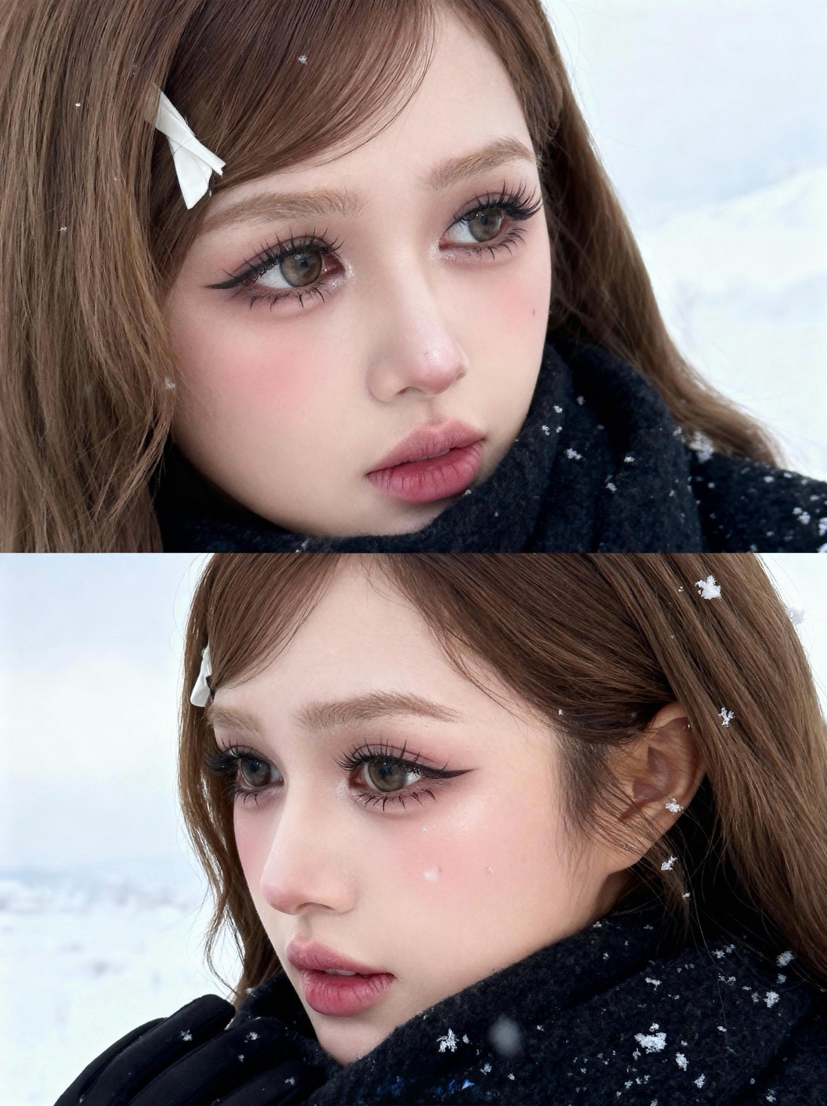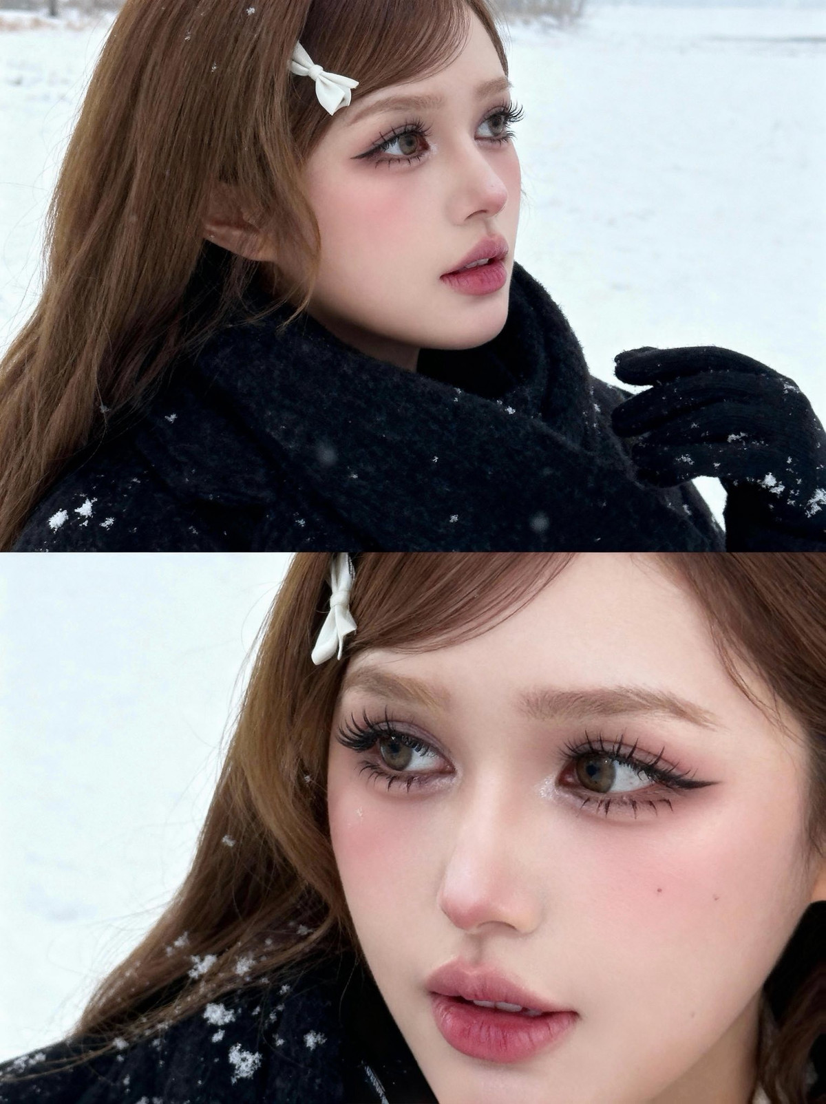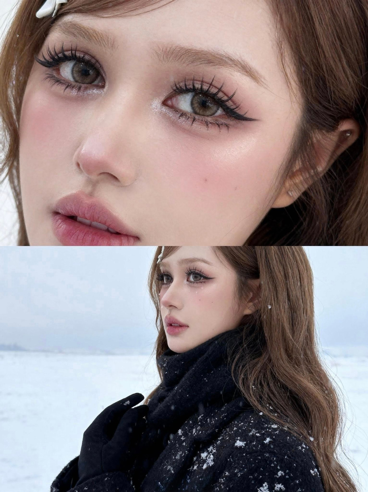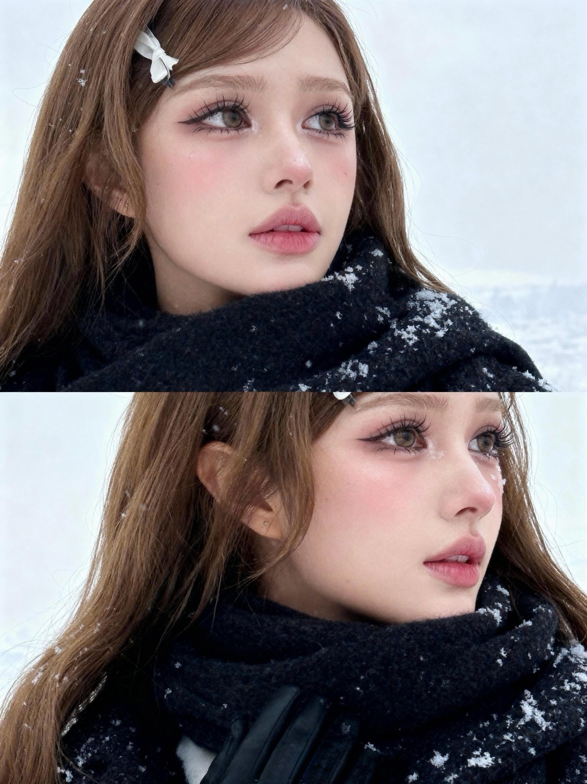 Chiếc kẹp tóc hình nơ trắng nhỏ nhắn cài trên mái tóc nâu dài lượn sóng càng làm tăng thêm vẻ đáng yêu, tinh nghịch, khiến người xem liên tưởng đến những nàng công chúa bước ra từ truyện cổ tích giữa trời tuyết. (Ảnh: FBNV)