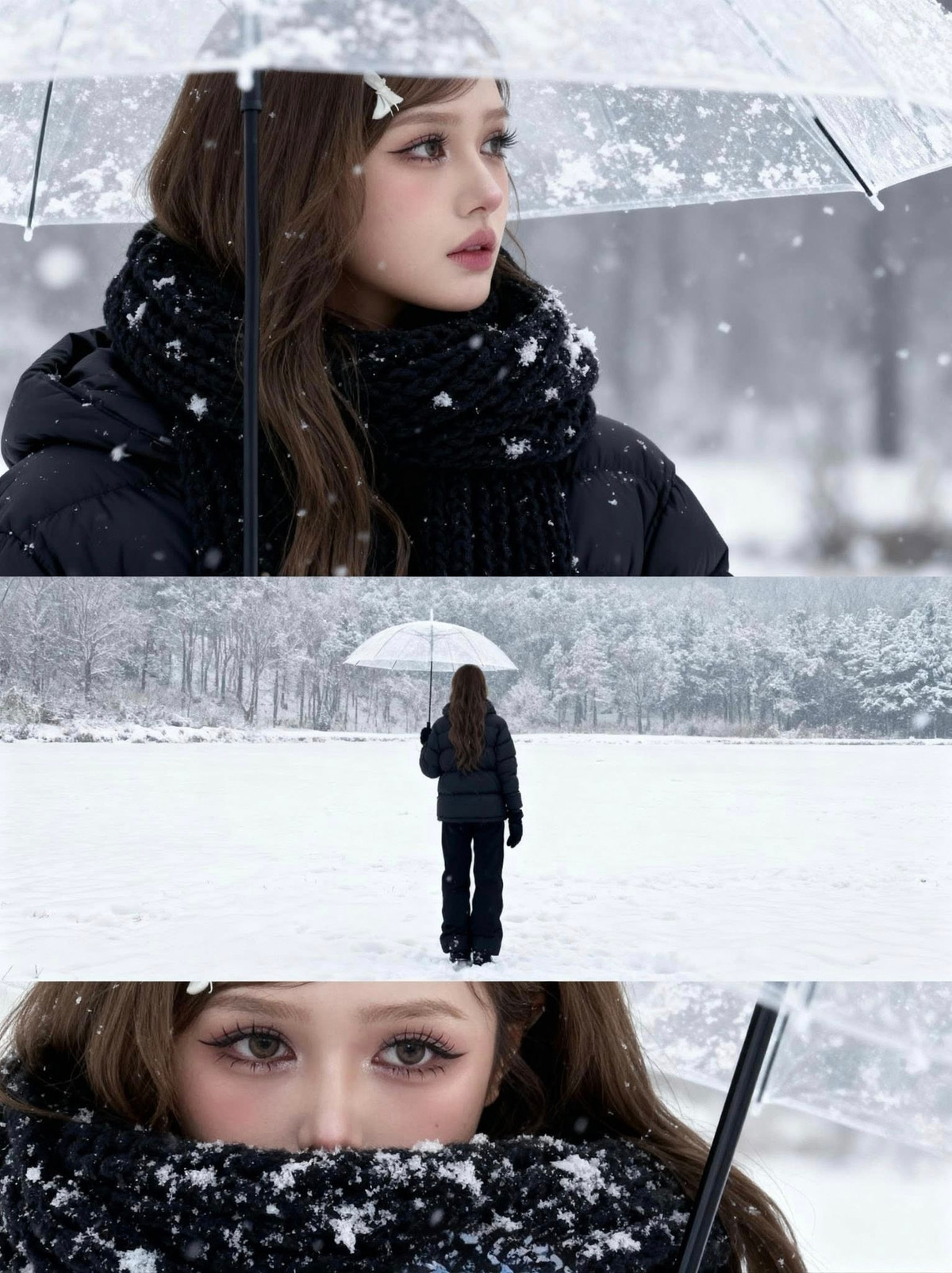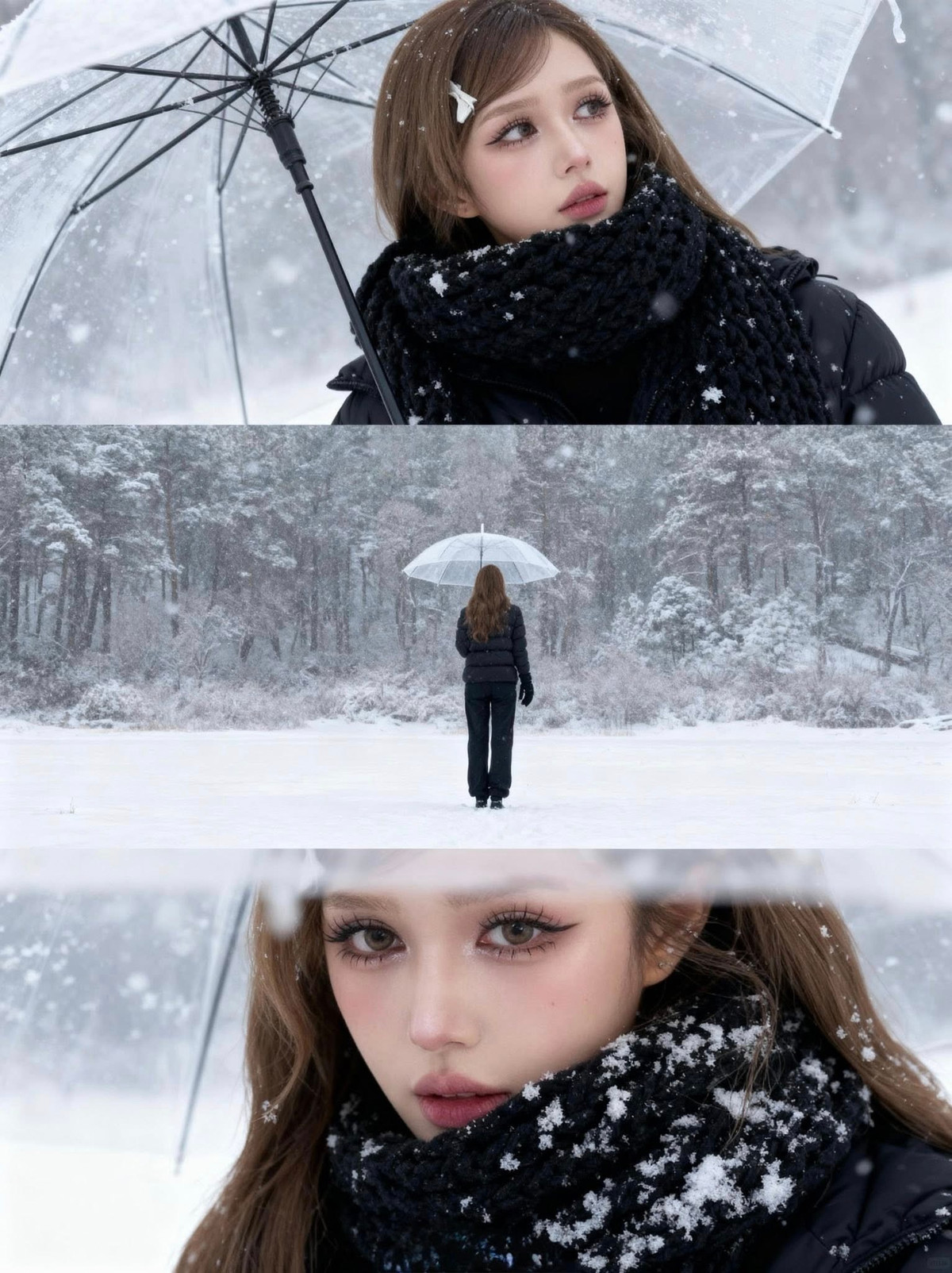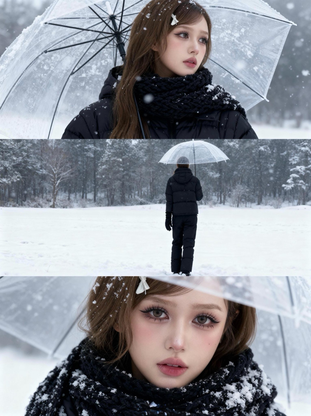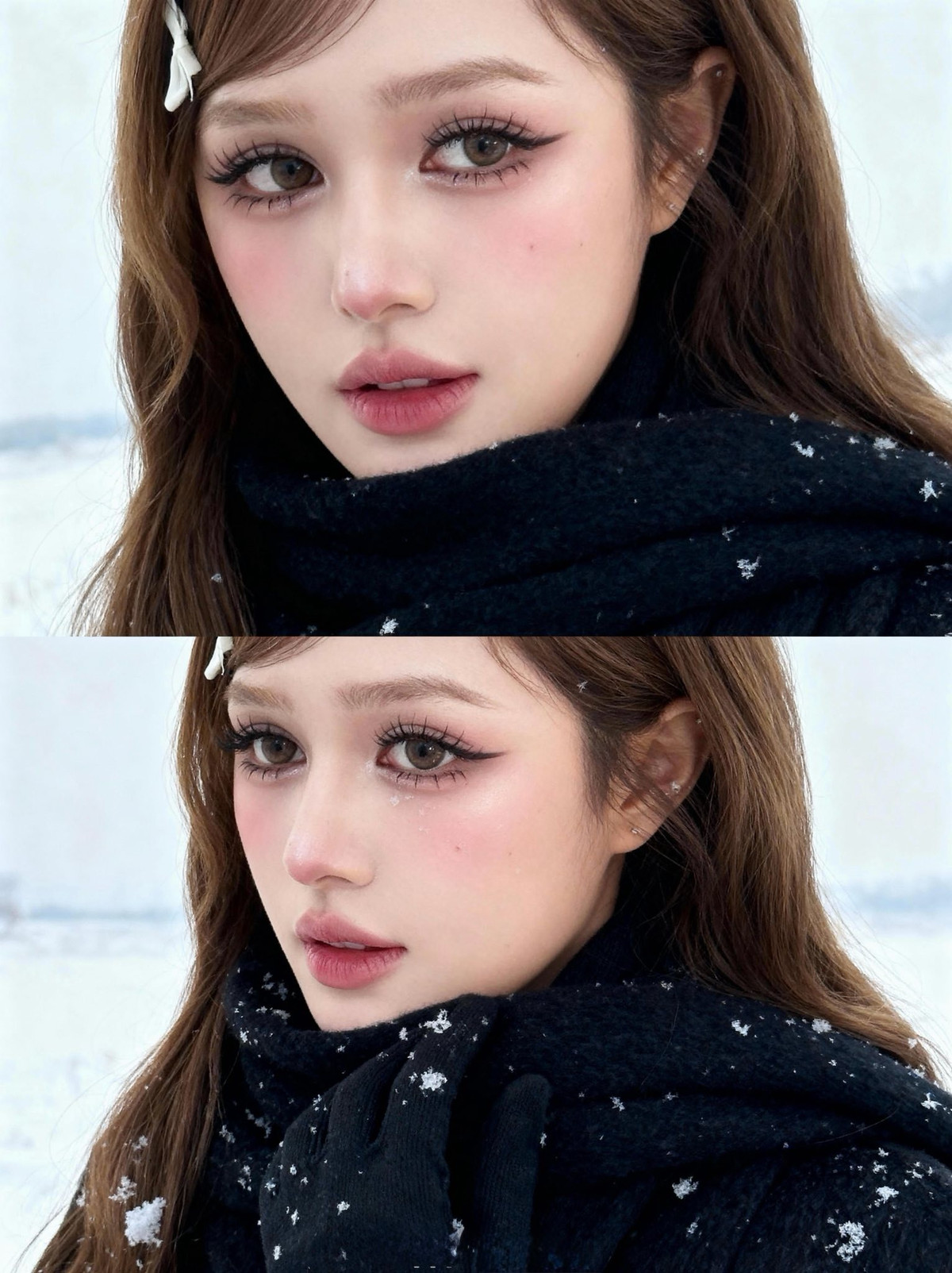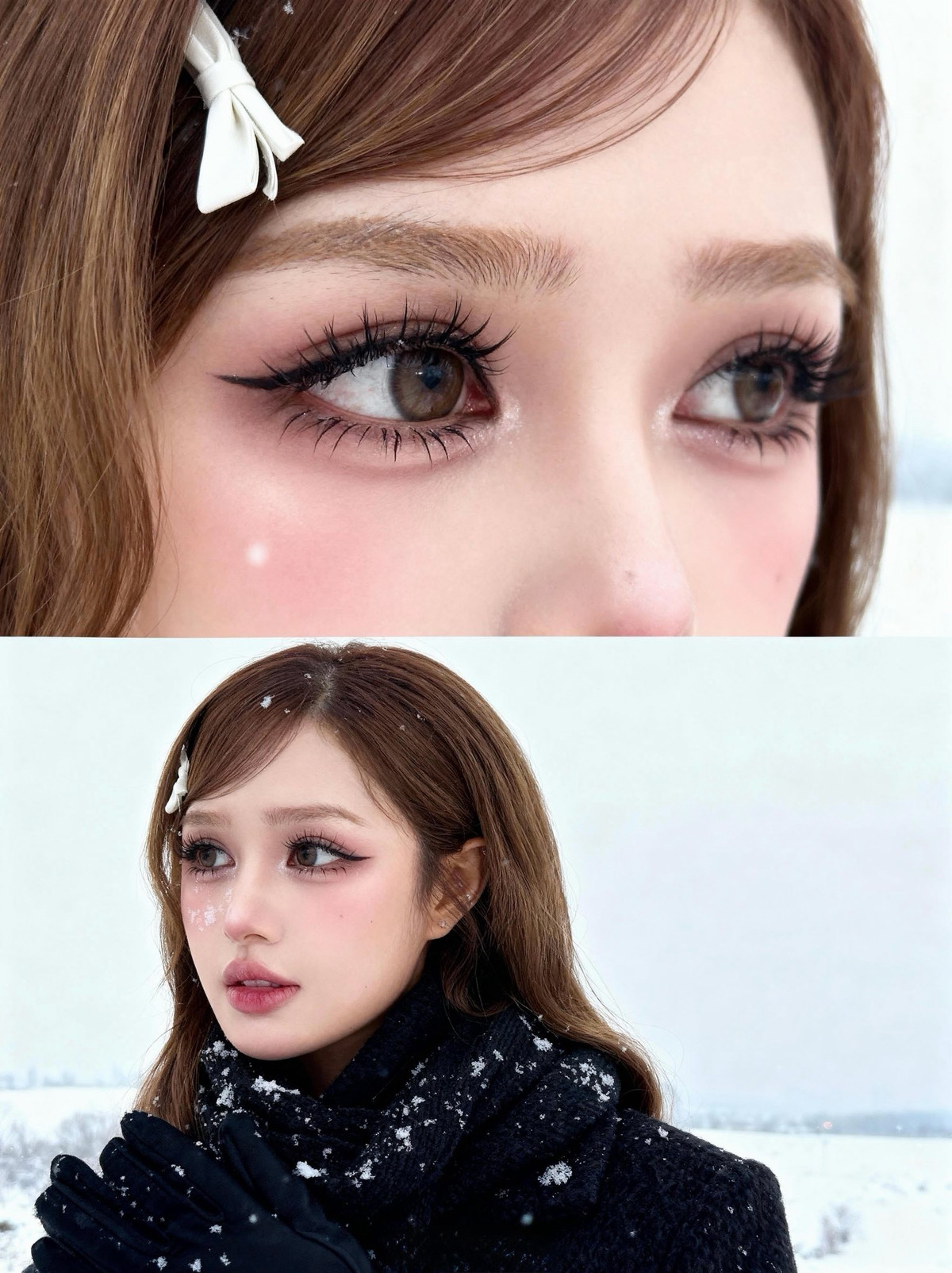Chiếc kẹp tóc hình nơ trắng nhỏ nhắn cài trên mái tóc nâu dài lượn sóng càng làm tăng thêm vẻ đáng yêu, tinh nghịch, khiến người xem liên tưởng đến những nàng công chúa bước ra từ truyện cổ tích giữa trời tuyết. (Ảnh: FBNV)