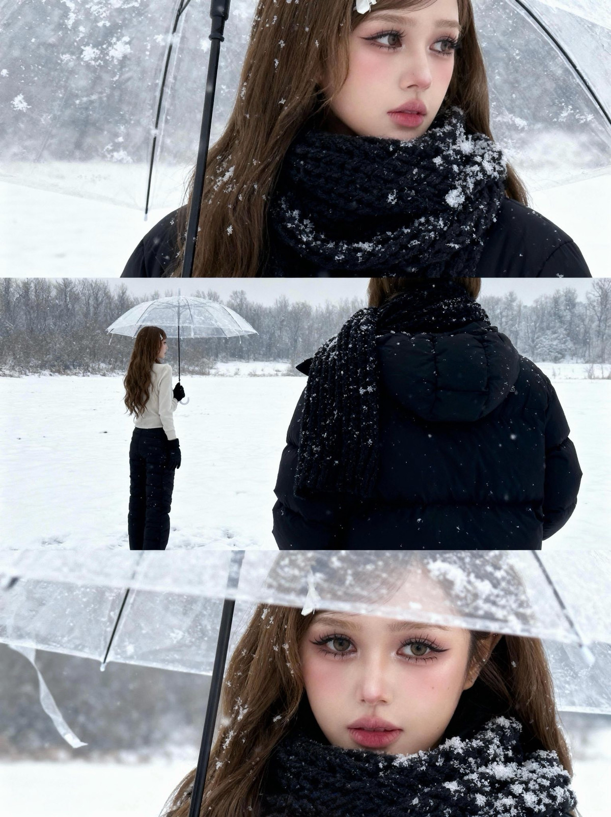 Trong loạt ảnh được chia sẻ, Xoài Non hóa thân thành nàng thơ mùa đông với trang phục tông đen ấm áp với áo khoác phao và chiếc khăn len bản to quấn cổ, tương phản nổi bật với tuyết trắng tinh khôi. (Ảnh: FBNV)