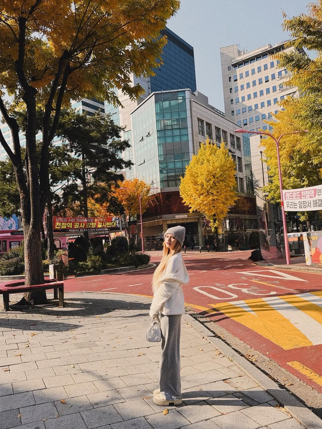 Loạt ảnh của Xoài Non gây ấn tượng mạnh mẽ với khung cảnh đường phố Hàn Quốc ngập tràn lá vàng, lá đỏ. Nàng hot girl hóa thành nàng thơ mùa thu, dạo bước trên vỉa hè lát đá, dưới những tán cây ngân hạnh rực rỡ. (Ảnh: IGNV)