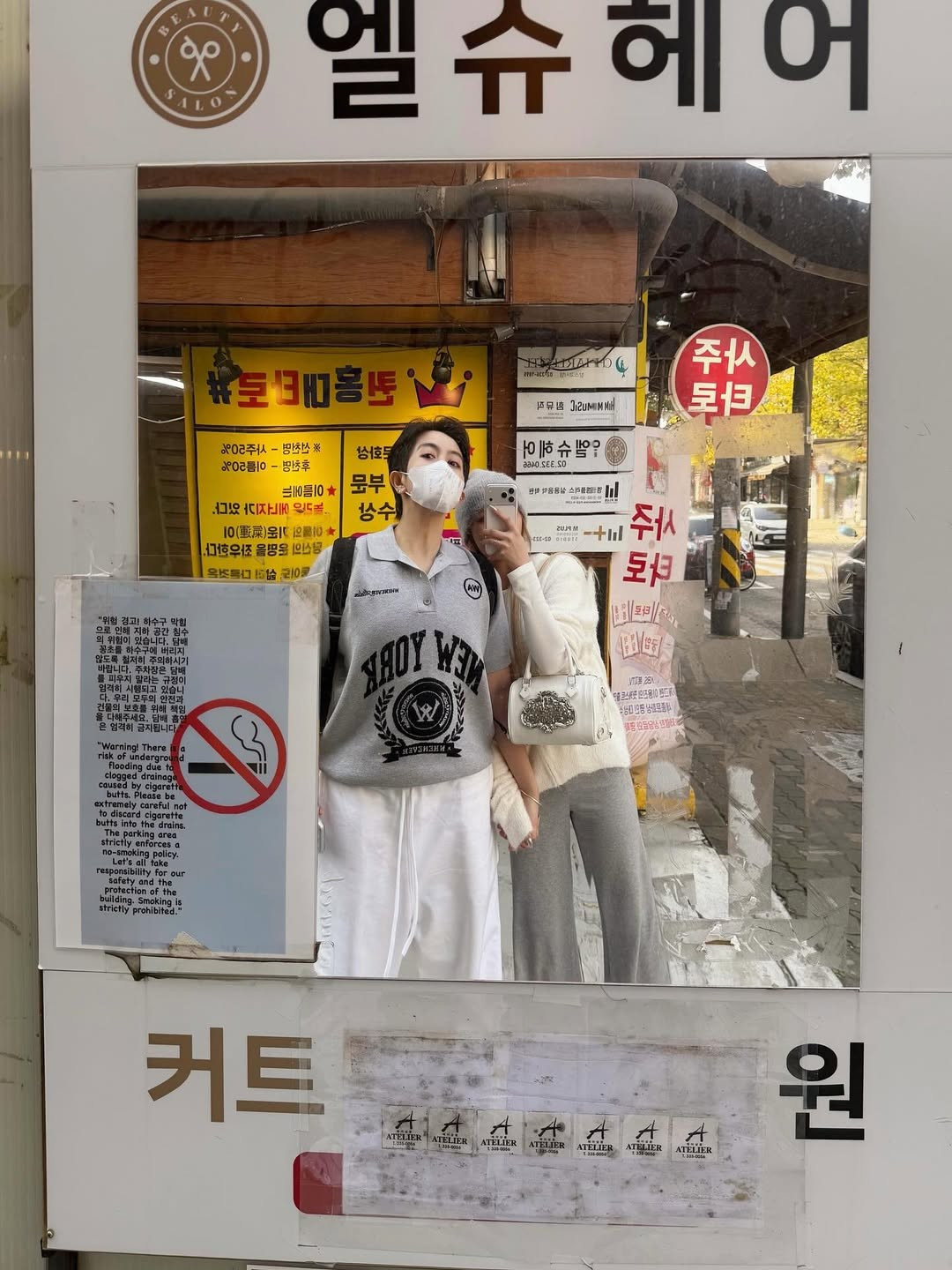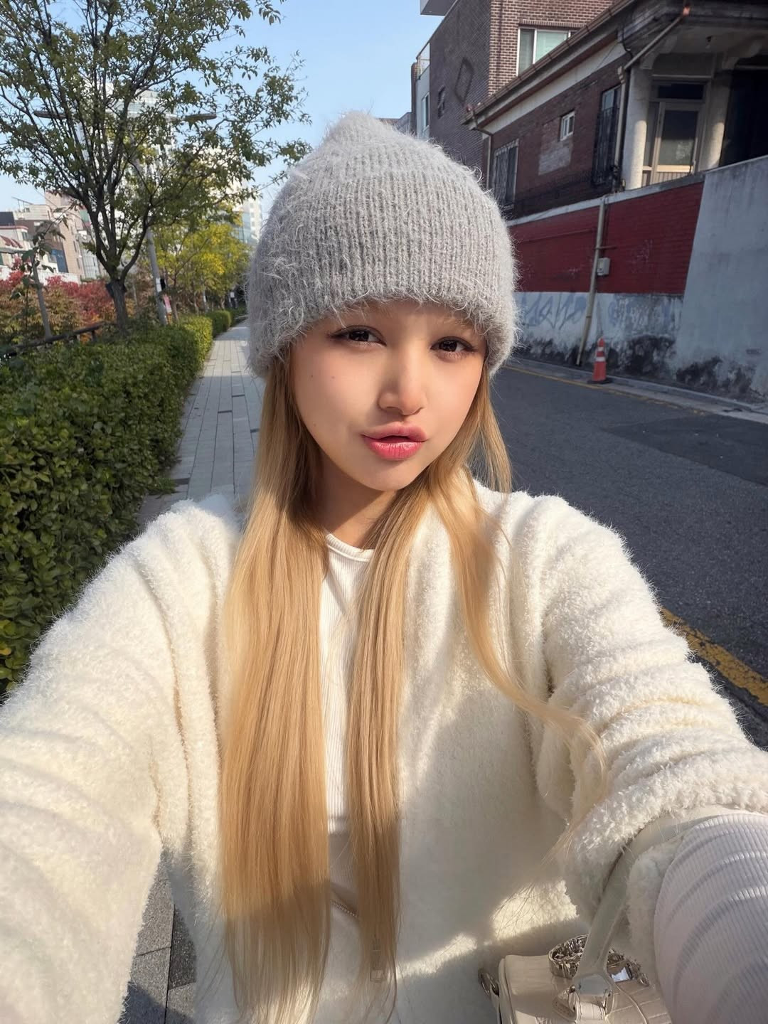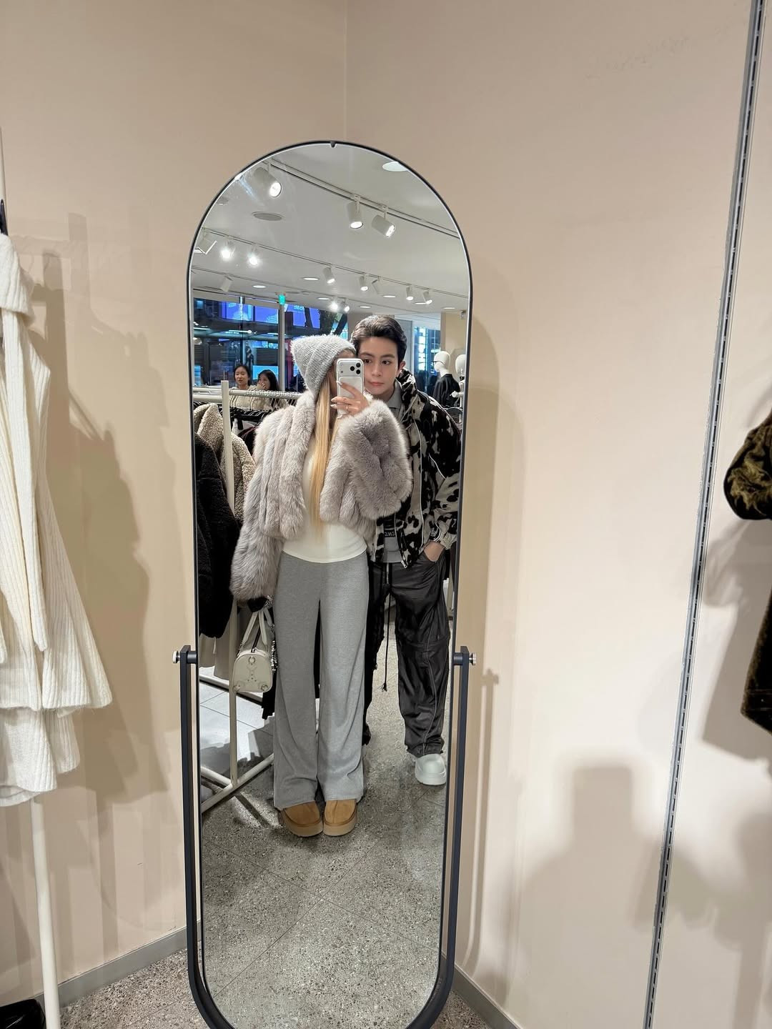 Cặp đôi thể hiện sự gắn kết qua phong cách thời trang đồng điệu. Xoài Non diện những item ấm áp, tôn dáng như áo len trắng xù lông, quần jogger xám ống rộng và mũ len lông xù thời thượng. (Ảnh: IGNV)