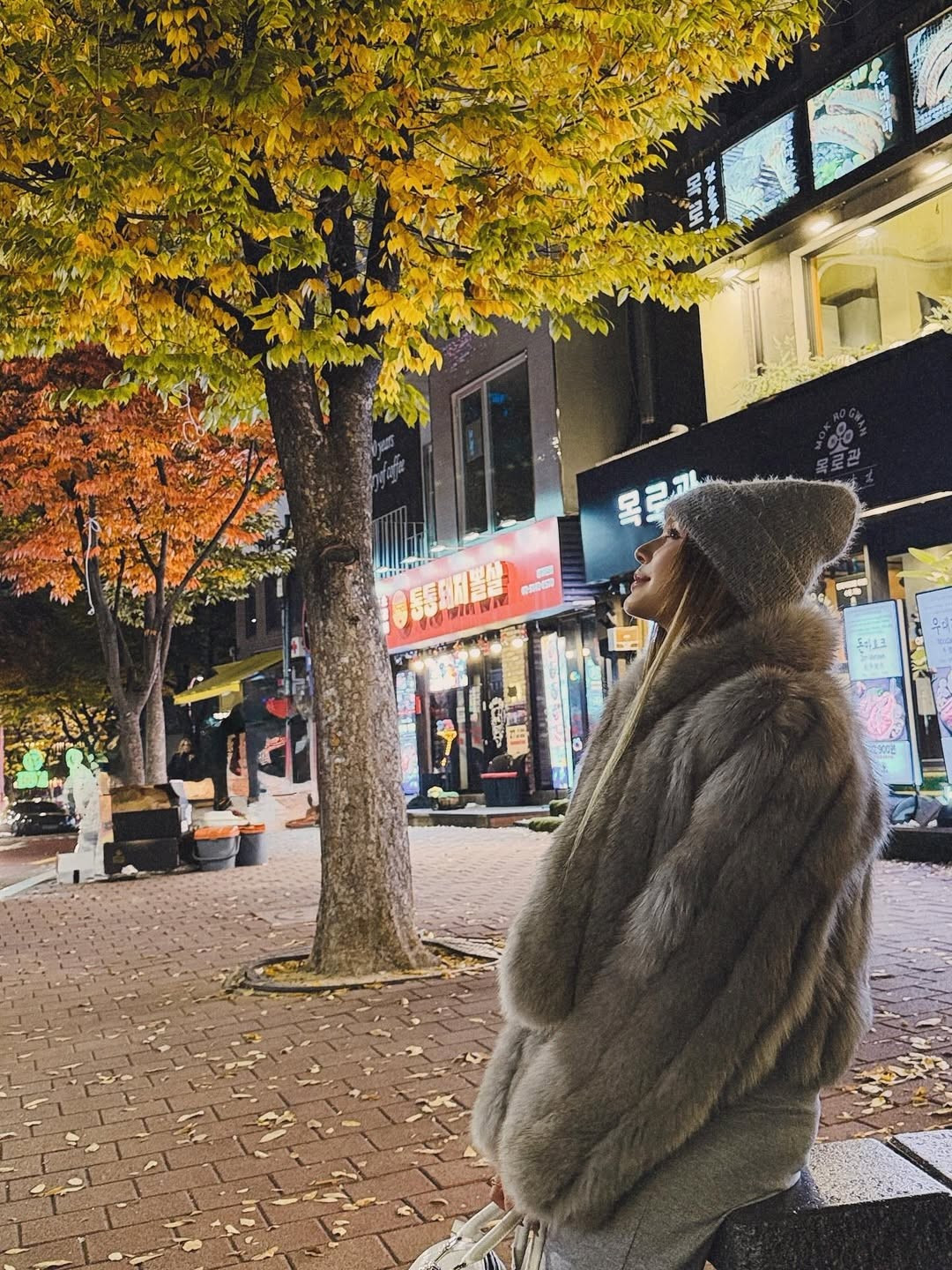 Cô nàng còn khoe khoảnh khắc check-in buổi tối với chiếc áo khoác lông xám sành điệu, vô cùng nổi bật. (Ảnh: IGNV)