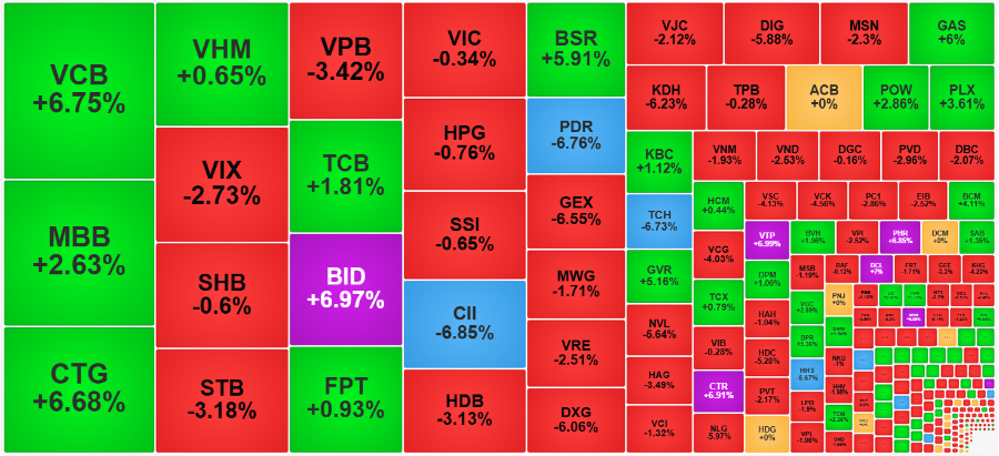 Khả năng nâng đỡ của dòng tiền không thể đạt diện rộng trong bối cảnh áp lực bán lan tràn như vậy. Khoảng 60 mã còn tăng giá từ 1% trở lên thì tầm một phần ba xuất hiện thanh khoản ấn tượng trên trăm tỷ đồng. Ngân hàng dĩ nhiên chiếm các vị trí dẫn đầu. Ngoài ra có BSR tăng 5,91%, GAS tăng 6%, POW tăng 2,86%, PLX tăng 3,61%, GVR tăng 5,16%, CTR tăng 6,91%, BCM tăng 4,11%, VTP tăng 6,99%, PHR tăng 6,85%.