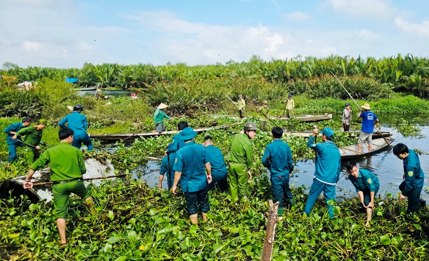 Huy động nhân lực vớt bèo lục bình, khơi thông dòng chảy trên các dòng sông. Ảnh: A.PHONG