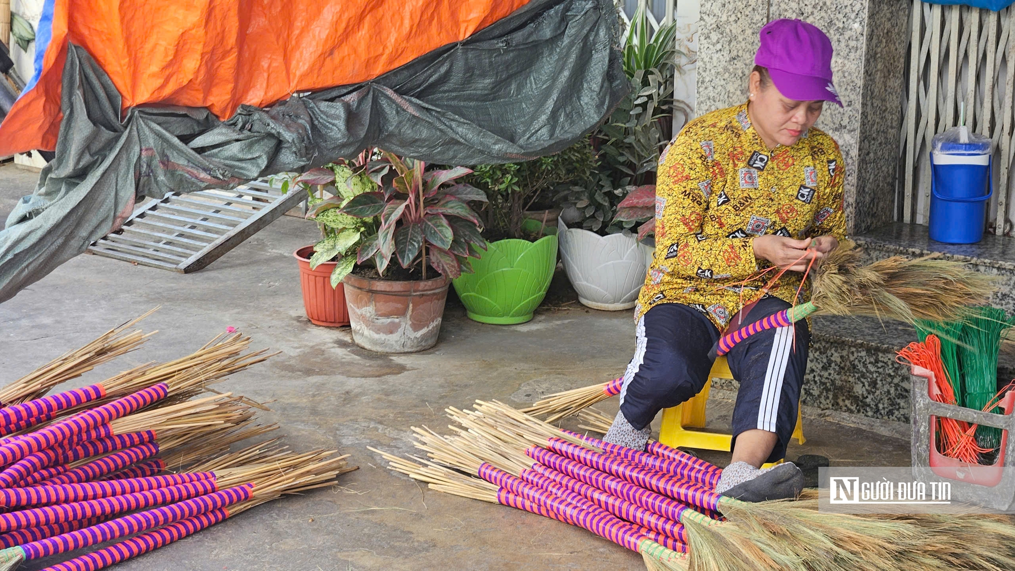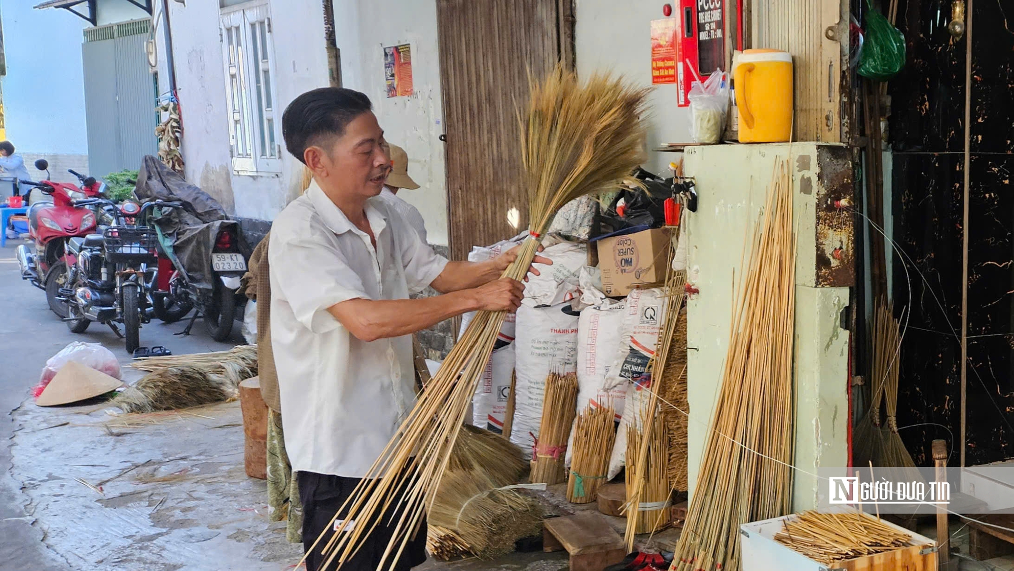 Đi sâu vào xóm, trước hiên mỗi căn nhà vẫn còn những bó đót vàng óng, những cây chổi dựng nghiêng. Trên khoảng sân nhỏ, người thợ ngồi cặm cụi làm việc, đôi tay thoăn thoắt như đã thành phản xạ sau hàng chục năm gắn bó. Công việc bắt đầu từ sáng sớm, lặp lại đều đặn qua từng ngày - xé bông đót, làm tua, cột lọ, bó chổi, bện chổi, quấn cán, chặt tề… Tất cả đều làm bằng tay.