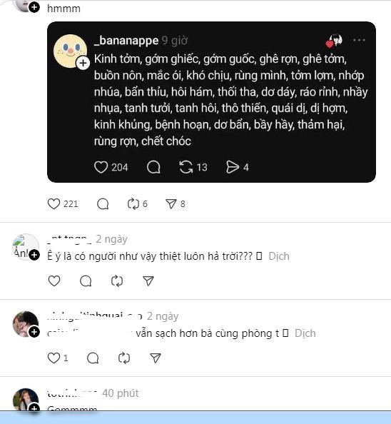Một bình luận với toàn tính từ miêu tả cảm xúc: "Kinh tởm, gớm ghiếc, gớm guốc, ghê rợn, ghê tởm, buồn nôn, mắc ói, khó chịu, rùng mình, tởm lợm, nhớp nhúa, bẩn thỉu, hôi hám, thối tha, dơ dáy...". Bình luận này đã tóm gọn hoàn hảo cảm xúc của số đông.