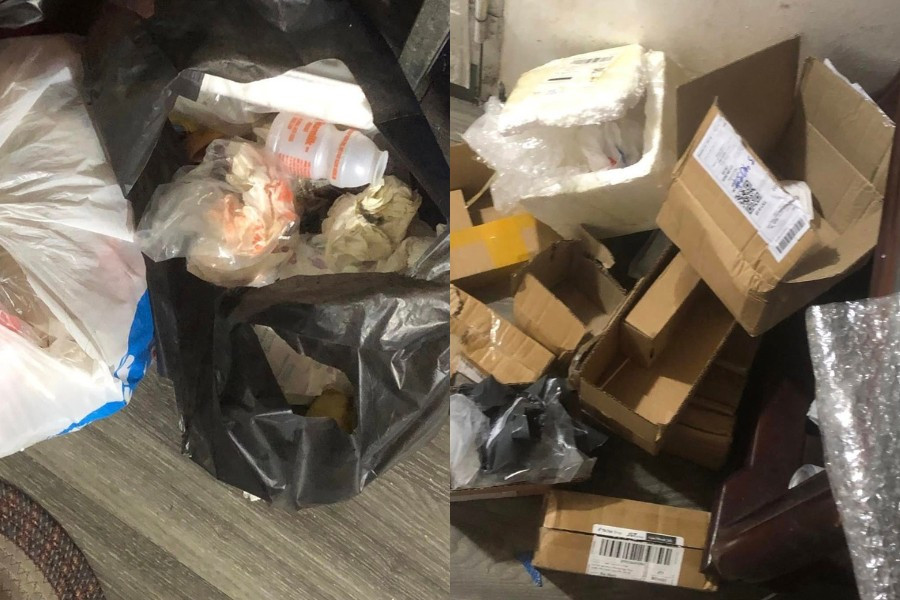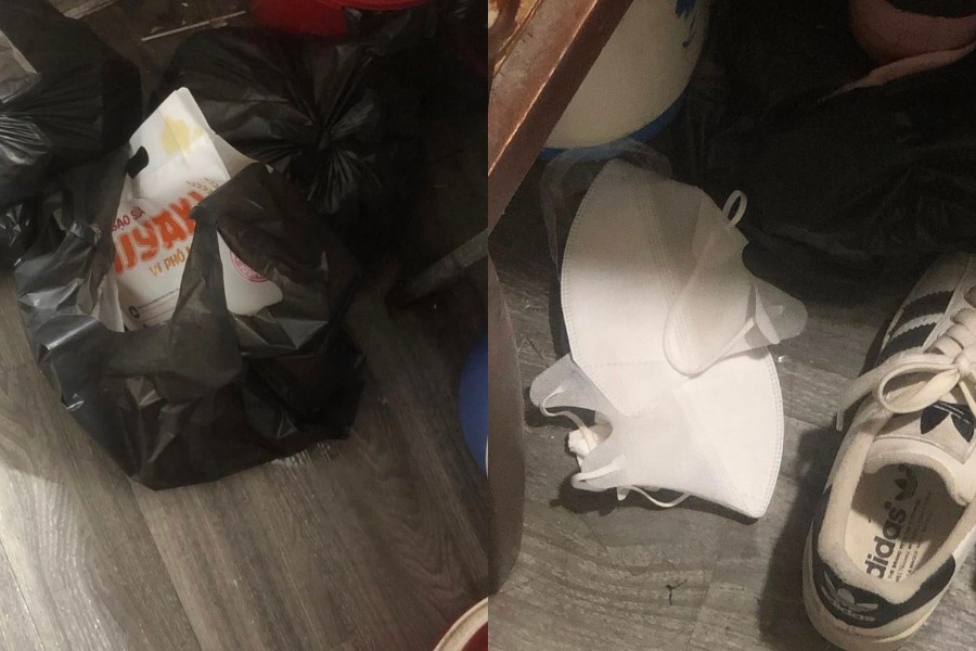 Trong những hình ảnh đó, hàng loạt túi rác đen to tướng được chất thành đống, tràn cả ra ngoài, biến góc phòng thành một bãi chứa rác công cộng. Hộp carton, bao bì xốp sau khi mua sắm cũng được vứt tùy tiện. Thậm chí, khẩu trang y tế đã dùng cũng nằm ngay dưới sàn.