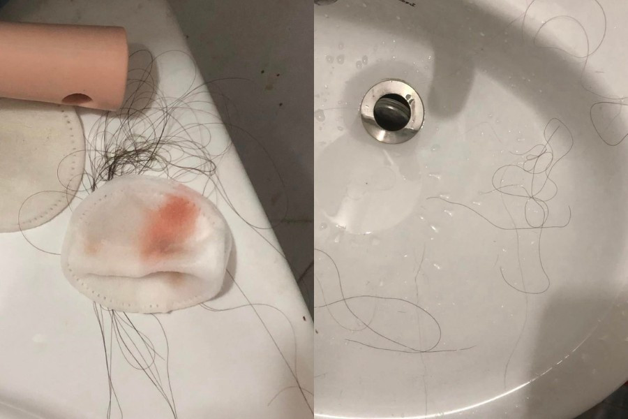 Điểm gây ám ảnh nhất chính là khu vực vệ sinh. Bồn rửa mặt cáu bẩn, ngập đầy tóc rụng và những miếng bông tẩy trang đã qua sử dụng (còn dính mỹ phẩm hoặc dịch thể màu đỏ) mà không hề được dọn dẹp. Đây là minh chứng rõ nhất cho sự thiếu ý thức vệ sinh cá nhân cơ bản.