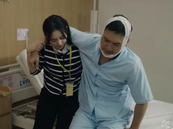 Thương (Quỳnh Kool) chăm sóc Lâm (Mạnh Trường) khi anh gặp chấn thương.