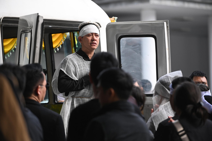 Tuấn Hưng đội khăn trắng chịu tang khi mẹ ruột qua đời. Nam ca sĩ lộ rõ vẻ đau buồn, mắt sưng húp do khóc quá nhiều. (Ảnh từ Đời sống và pháp luật)
