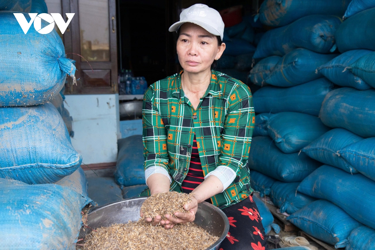 “Được 500 tấn rồi. Cứ mua từ 100- 200 nghìn một bao. Bùn đen hay nó mọc mộng nhiều thì mình sấy không được, nhiều khi bị loại ra, mà cũng ráng giúp bà con chứ biết làm sao, thấy người ta tổn thất tội quá. Mình hỗ trợ tinh thần chứ nếu mình không mua người ta bỏ chứ làm gì được. Mình mang sấy xong rồi đi bán cho người ta làm thức ăn gia súc", chị Hiền cho hay.