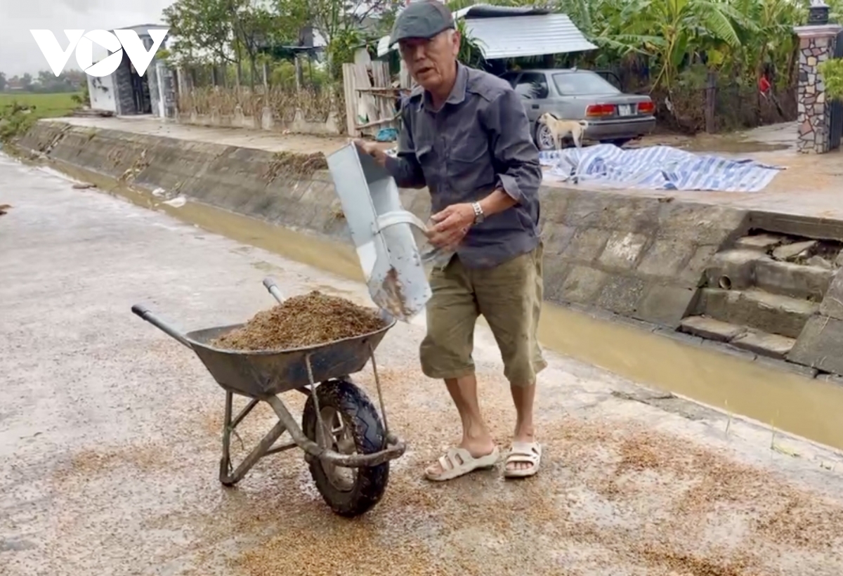 Ông Trịnh Liên (75 tuổi), khu phố Phước Bình Nam, phường Phú Yên, mang lúa bị ngâm nước lũ ra phơi nhưng lại phải chở vào vì gặp mưa.