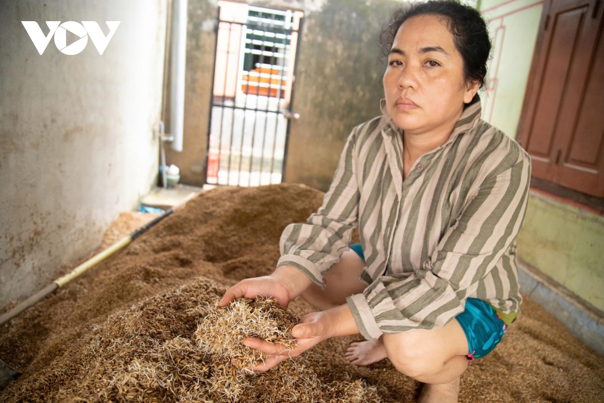 Cách nhà ông Liên không xa, bà Trần Thị Ái Mến, đứng thất thần giữa kho lúa gần 5 tấn, thành quả của cả năm trời cày cấy đã mất trắng vì bị ướt và mọc mầm. Nợ phân, nợ thuốc chưa biết lấy gì trả, con cái đang tuổi ăn học, cuộc sống gia đình bà rất khó khăn.
