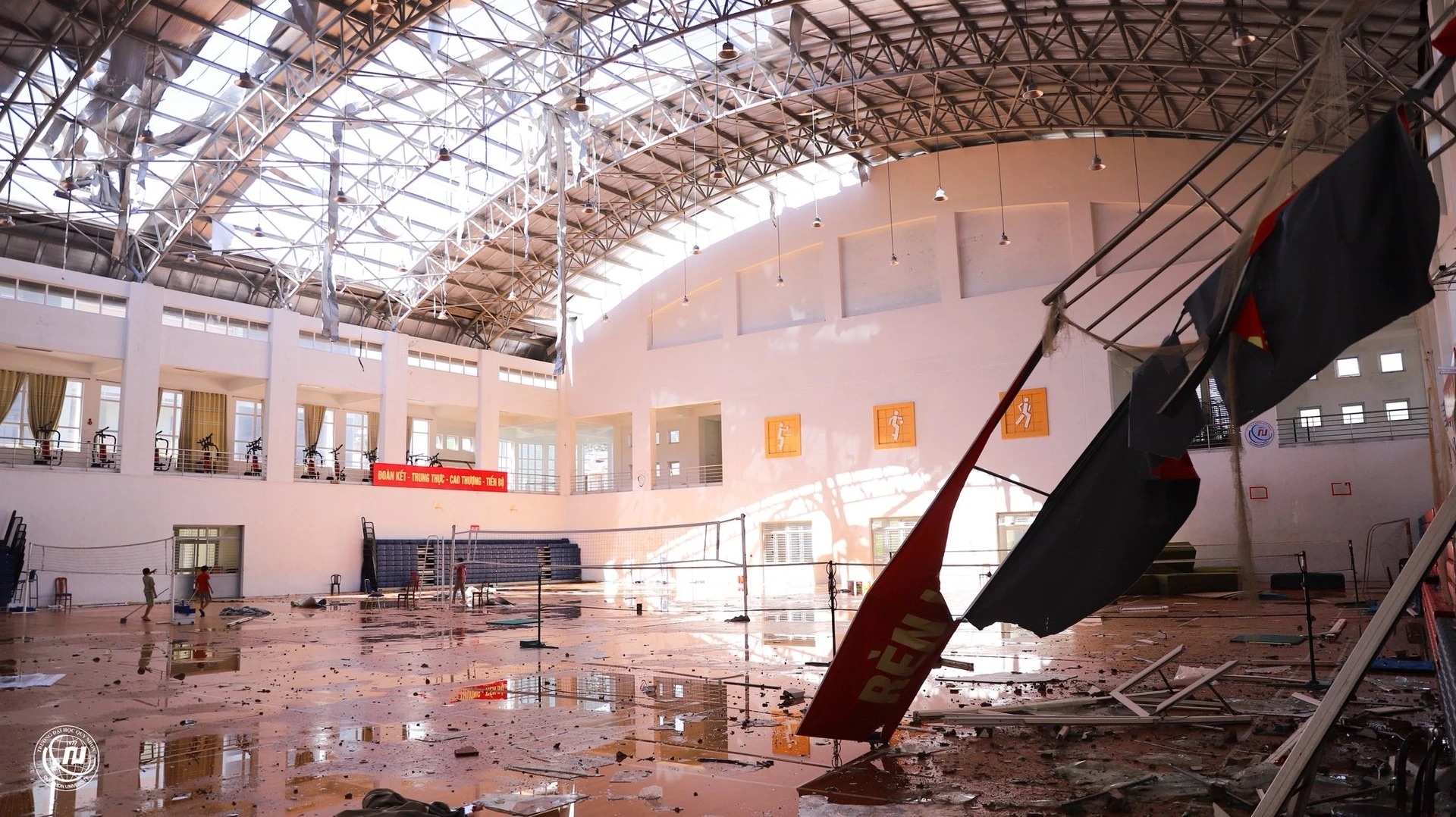 Đại học Quy Nhơn gánh thiệt hại nghiêm trọng. Gió mạnh khiến nhiều dãy nhà của trường tốc mái, vụn kính vỡ văng khắp nơi. (Ảnh: Đại học Quy Nhơn).