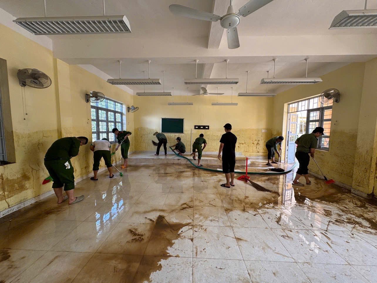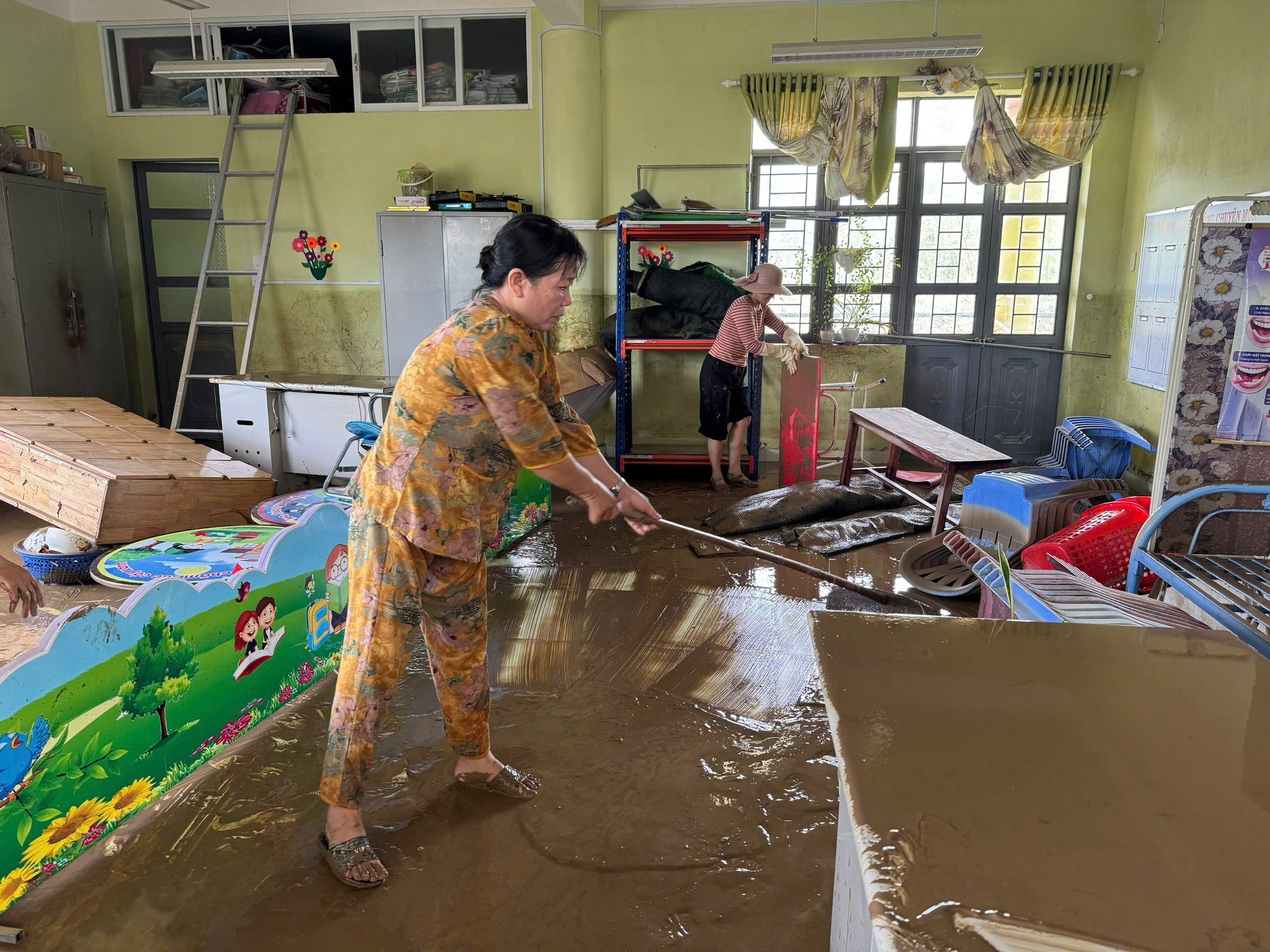 Tại xã Tuy An Bắc, giáo viên trường mầm non An Định đã bắt tay dọn dẹp sau lũ (Ảnh: Truyền hình Đắk Lắk).