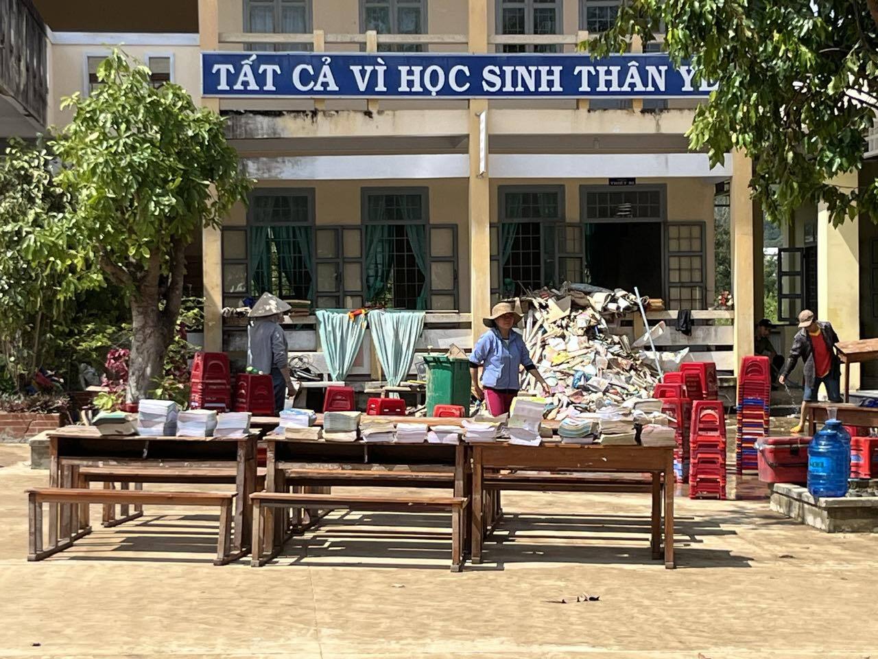 Giáo viên phơi sách vở, tài liệu bị ướt tại trường THCS Lê Văn Tám, xã Phú Mỡ. (Ảnh: Báo Đắk Lắk)