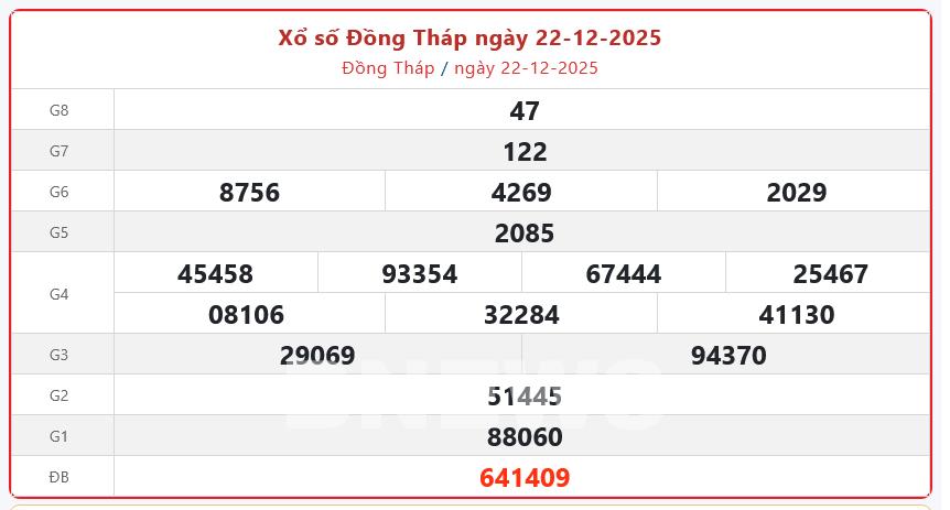 Kết quả xổ số Đồng Tháp Thứ Hai ngày 22/12/2025