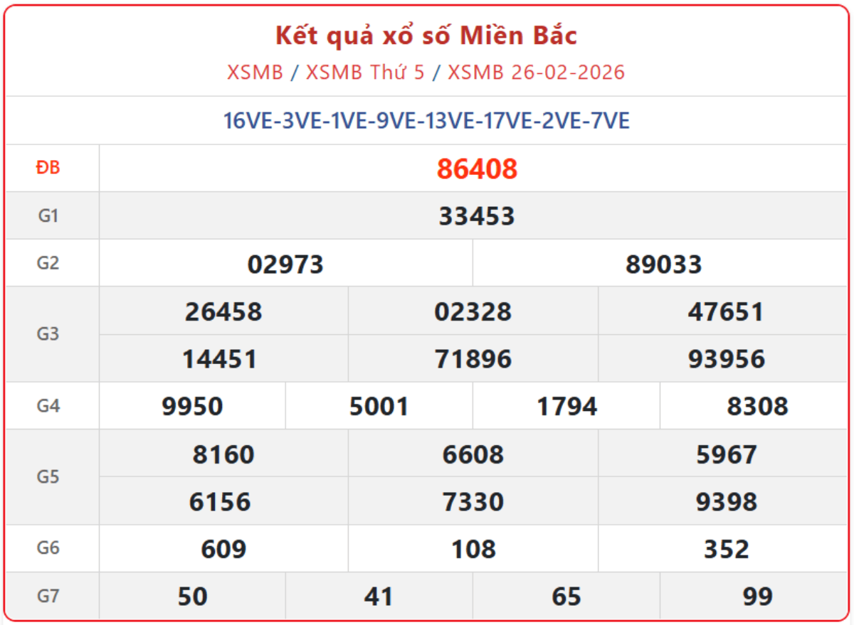 - Xổ số miền Bắc mới nhất ngày 26/2/2026. Xem lại KQXSMB ngày 26/2/2026