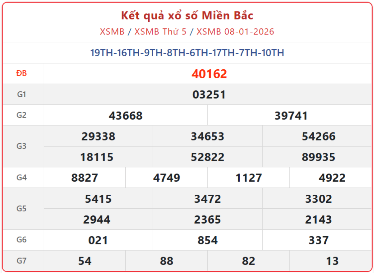 Kết quả xổ số theo giờ hôm nay ngày 8/1/2026, xem trực tiếp XSMB thứ 5 hàng tuần đầy đủ, chính xác nhất, được quay thưởng bởi Công ty xổ số kiến thiết Hà Nội (XSHN).