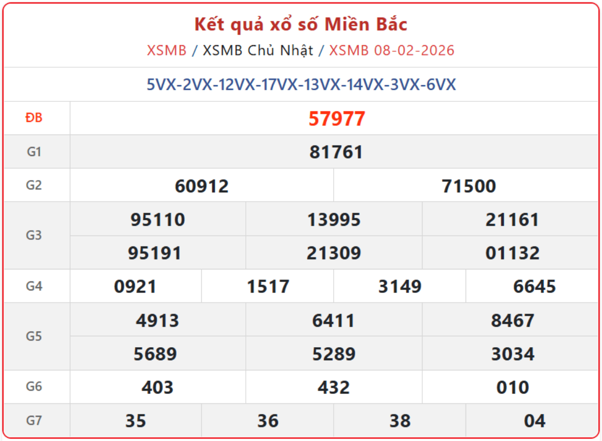 - Xổ số miền Bắc mới nhất ngày 8/2/2026. Xem lại KQXSMB ngày 8/2/2026